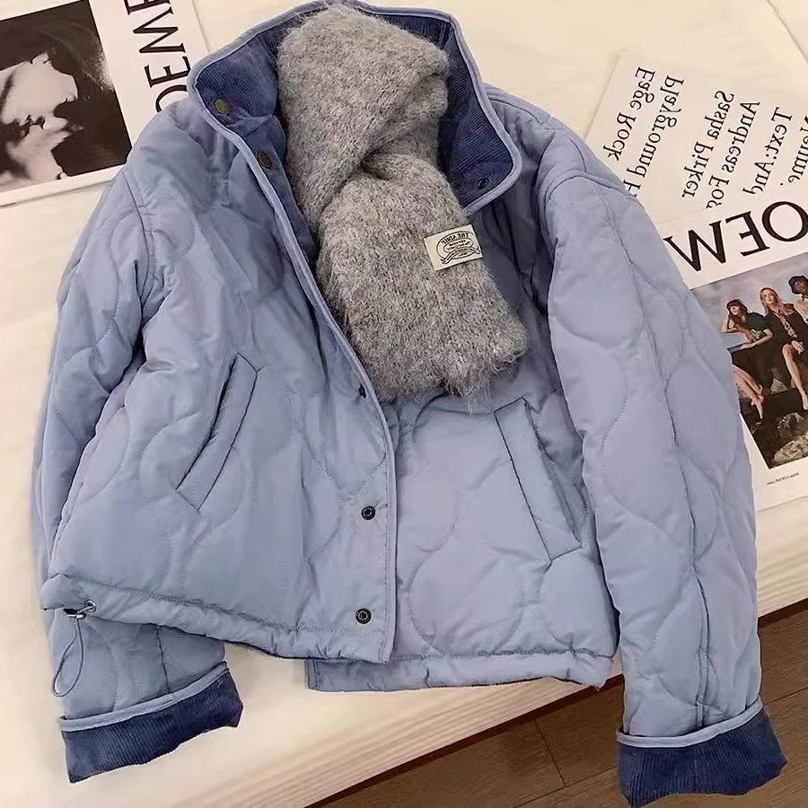FA50468# 韩版小众蓝色灯芯绒翻领棉服女秋冬减龄设计感宽松保暖夹棉外套潮 服裝批發女裝批發服飾貨源
