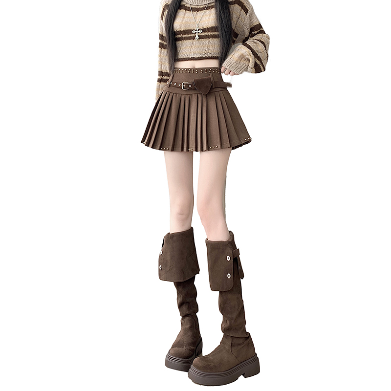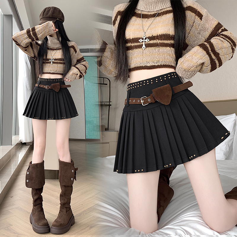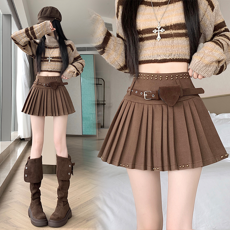 FA50662# 新版甜辣风百搭重工修身高腰毛呢百褶裙半身裙配送腰带 服裝批發女裝批發服飾貨源