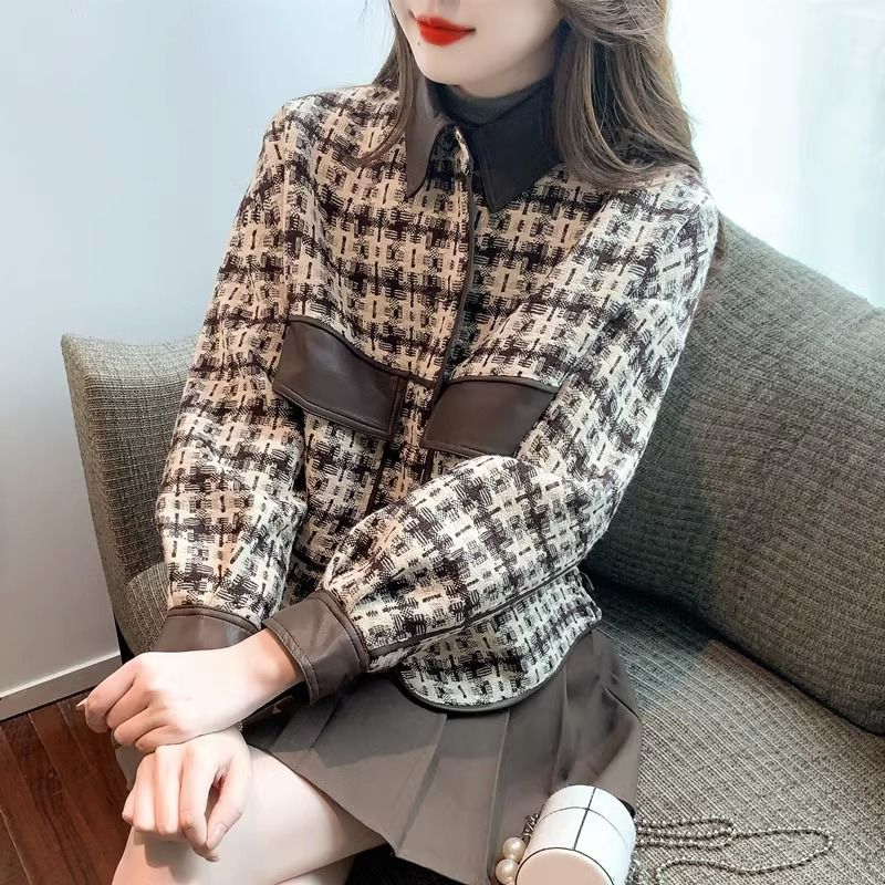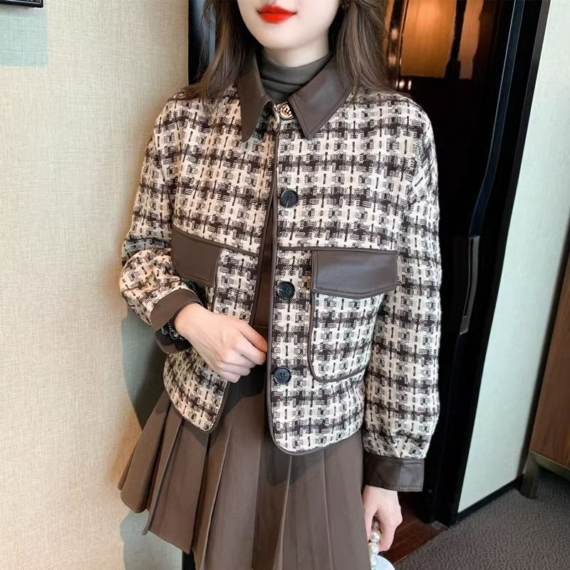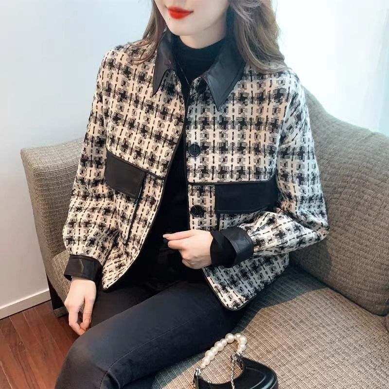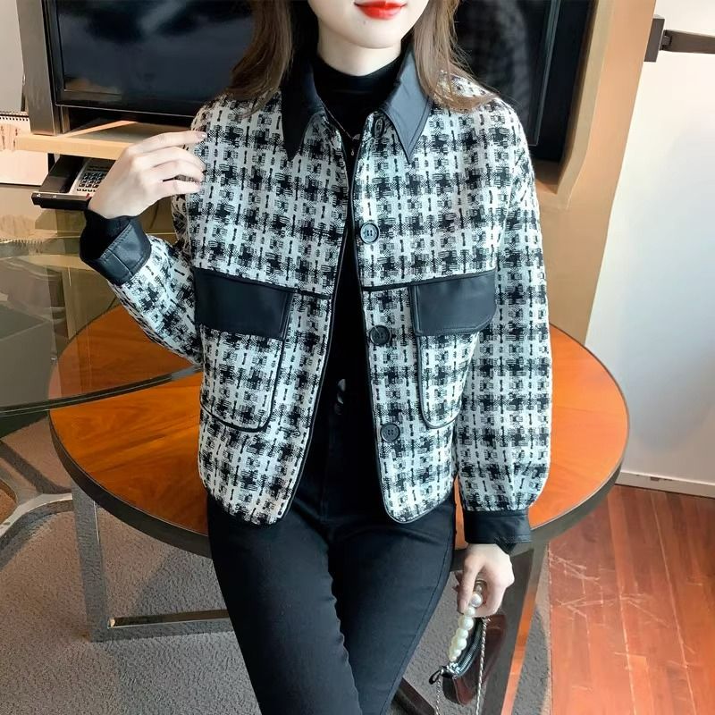 FA50845# 小香风千鸟格外套女秋冬新款复古拼接设计感短款宽松长袖上衣 服裝批發女裝批發服飾貨源