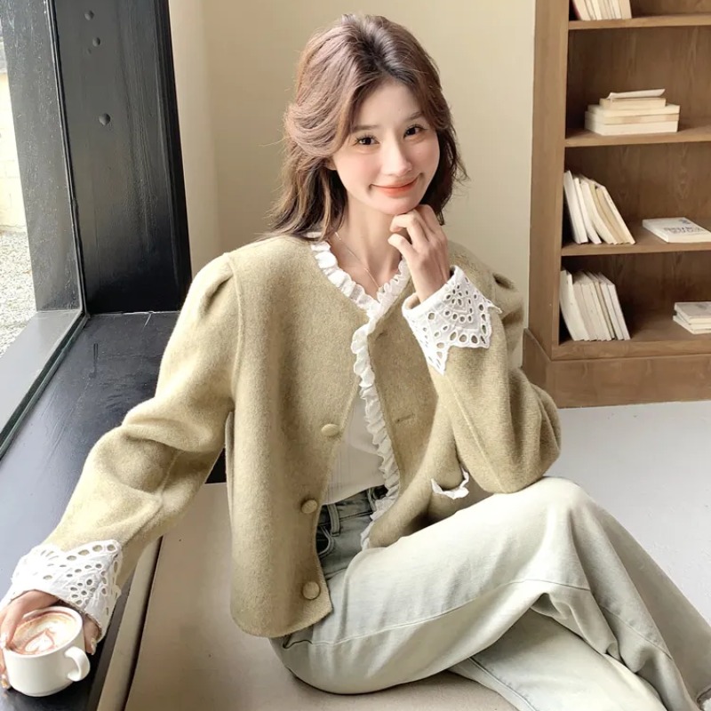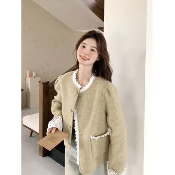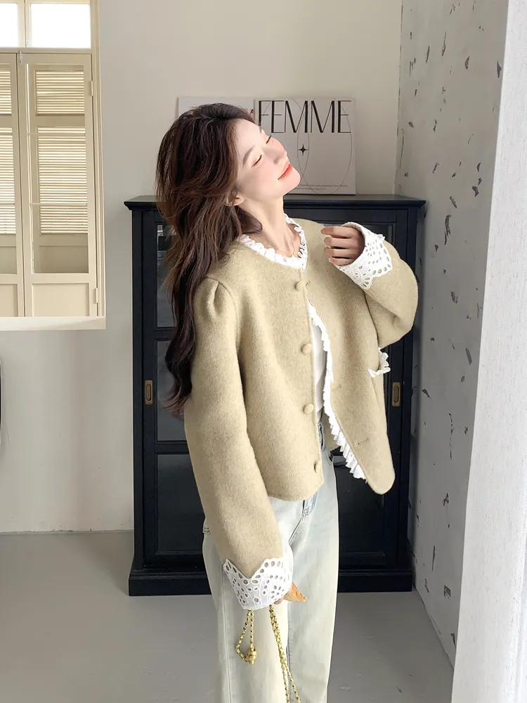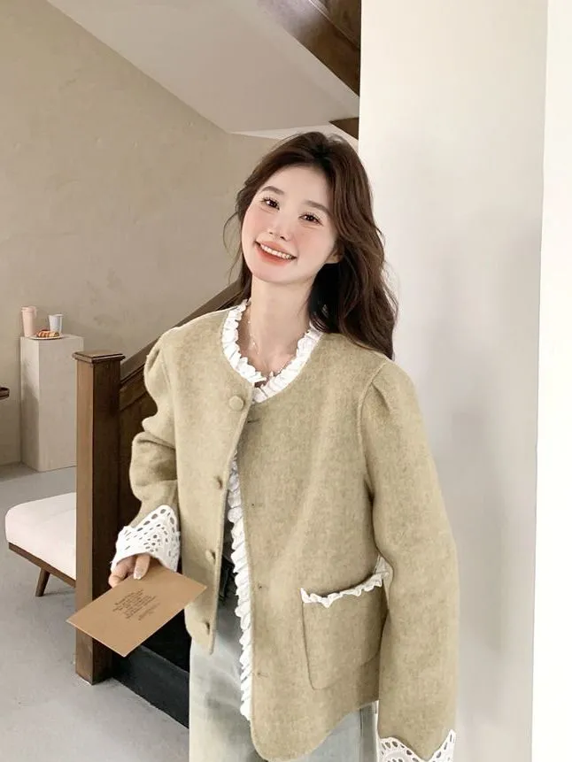 FA50848# 轻奢显瘦气质名媛蕾丝拼接羊毛呢子短外套上衣女春新款小个子 服裝批發女裝批發服飾貨源