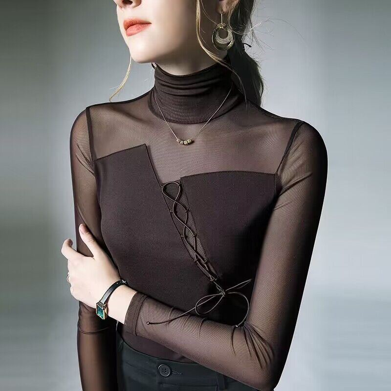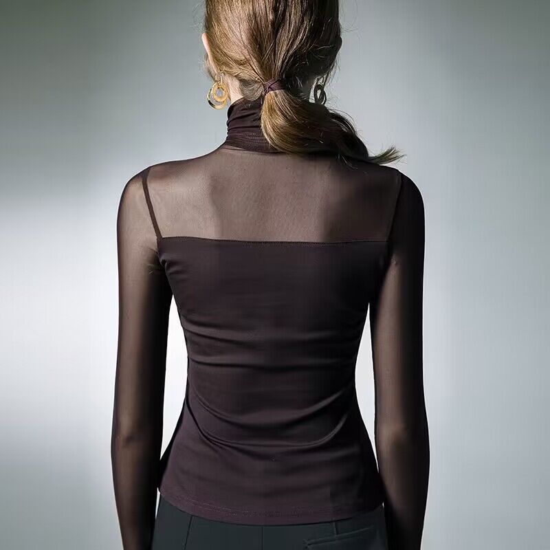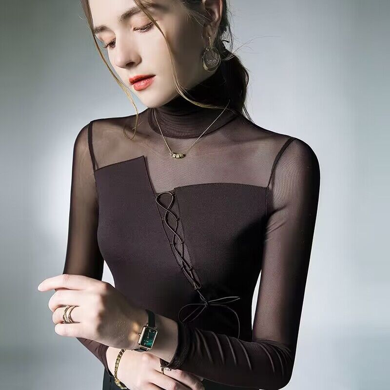 FA50956# 秋冬内搭修身网纱拼接长袖高领打底衫女性感露背漂亮时尚别致上衣 服裝批發女裝批發服飾貨源