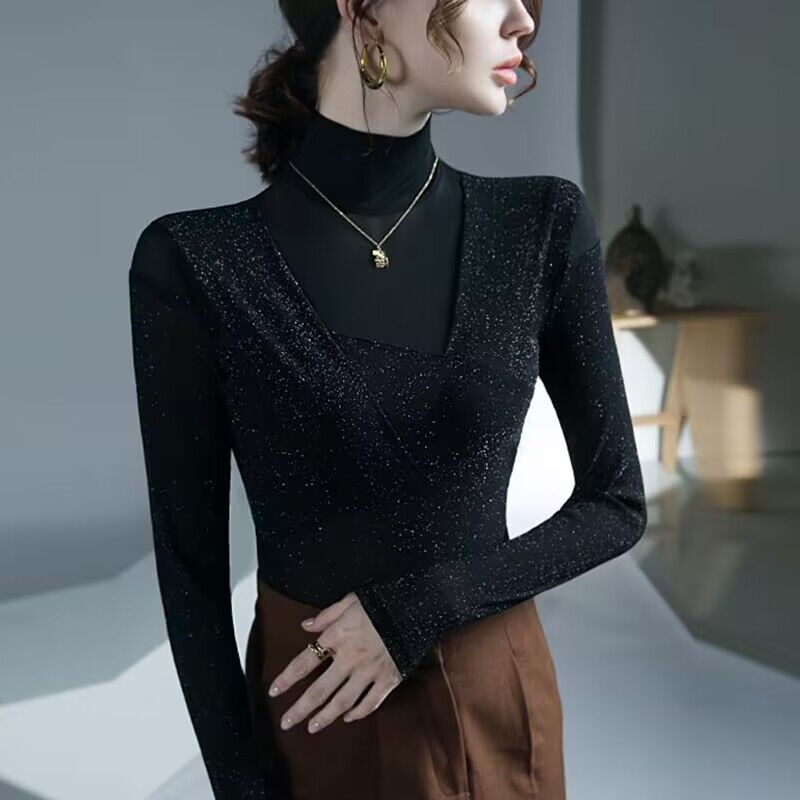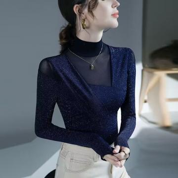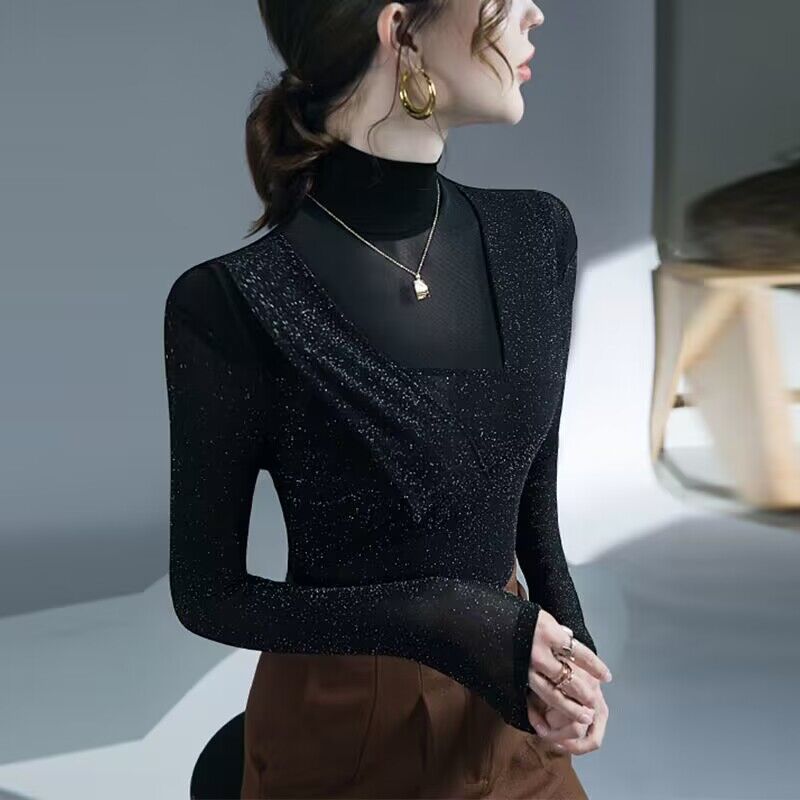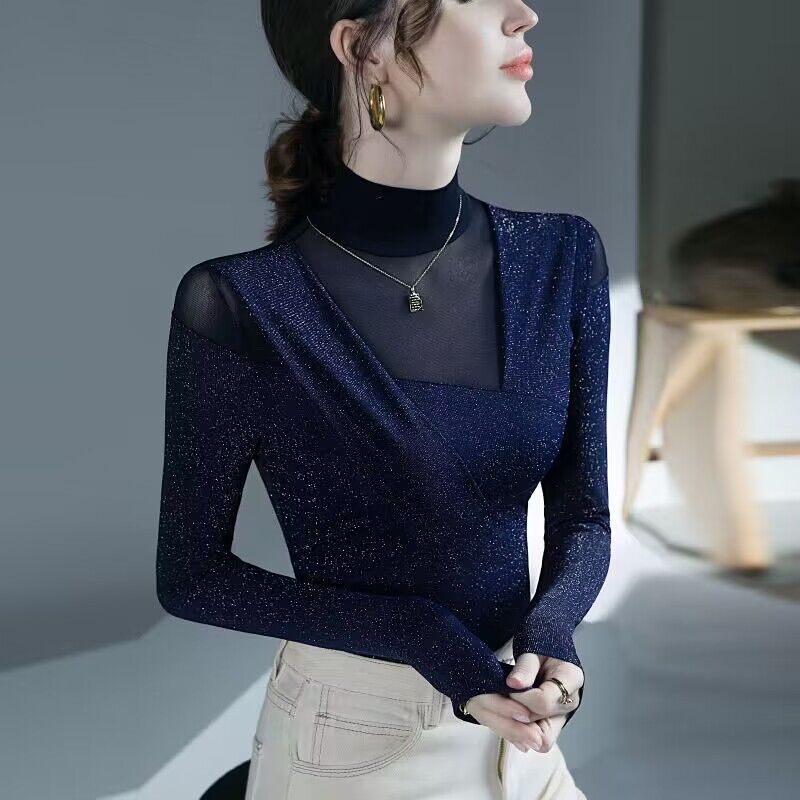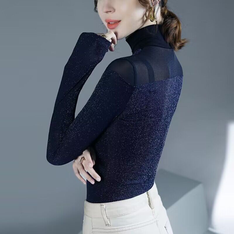 FA50958# 欧洲站网纱打底衫女秋冬新款内搭亮丝洋气上衣法式漂亮小衫 服裝批發女裝批發服飾貨源
