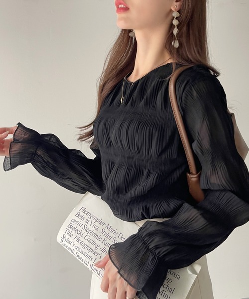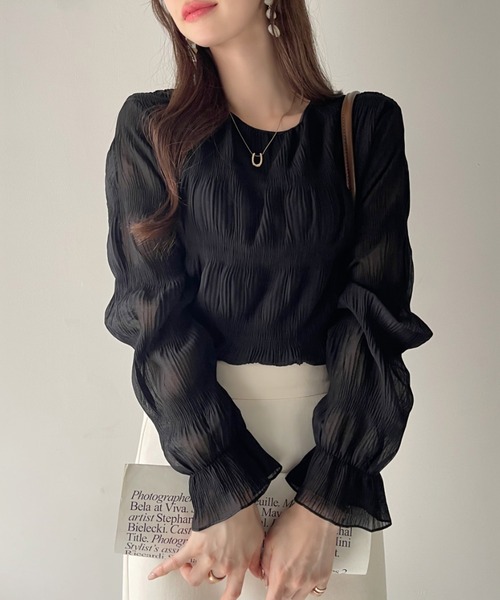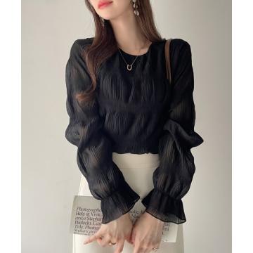 FA50961# 早春秋季超仙压褶雪纺衫宽松百搭长袖洋气女装褶皱圆领打底衫上衣 服裝批發女裝批發服飾貨源