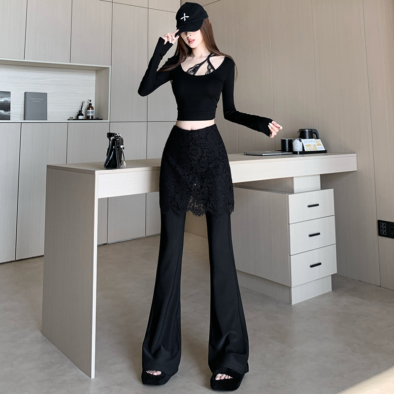 FA50966# 蕾丝拼接假两件微喇裤女冬季高腰加绒加厚修身包臀蕾丝屁帘喇叭裤 服裝批發女裝批發服飾貨源