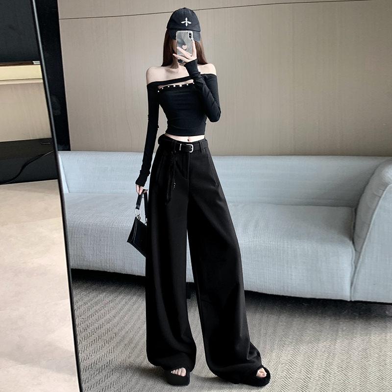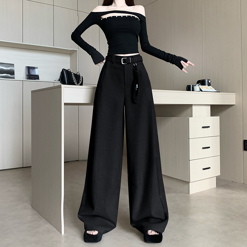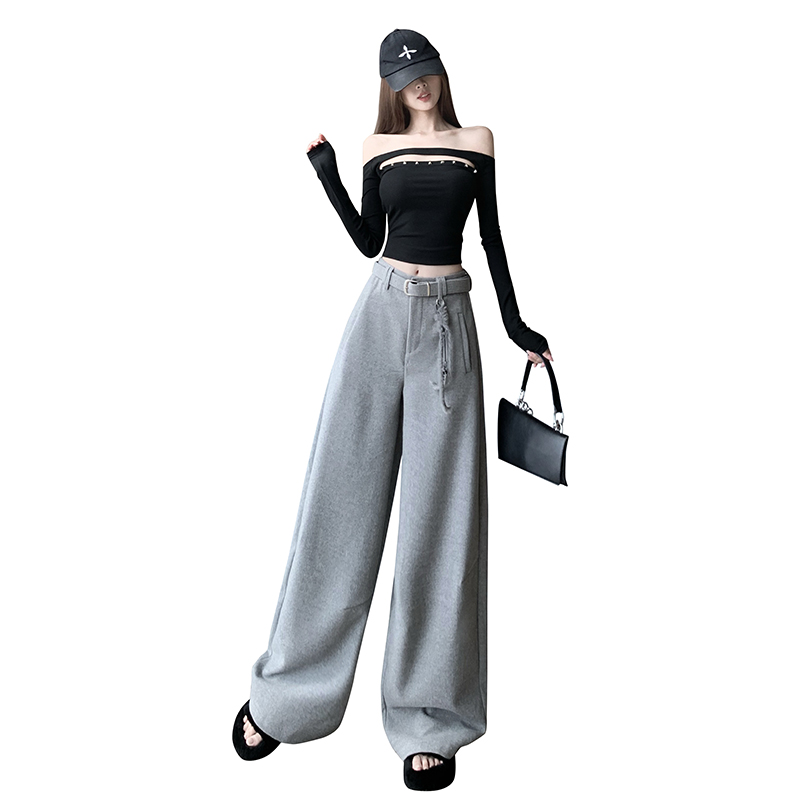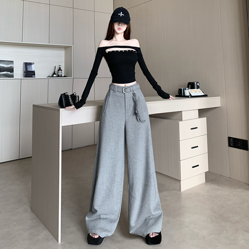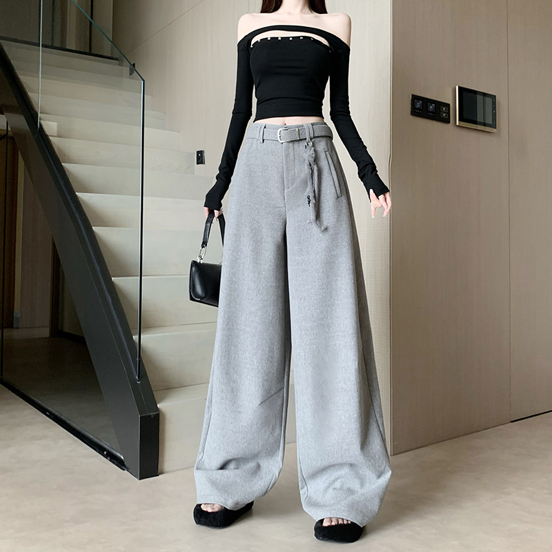 FA50967# 新款灰色羊毛弯刀阔腿裤女秋冬宽松显瘦抽绳直筒拖地长裤 服裝批發女裝批發服飾貨源