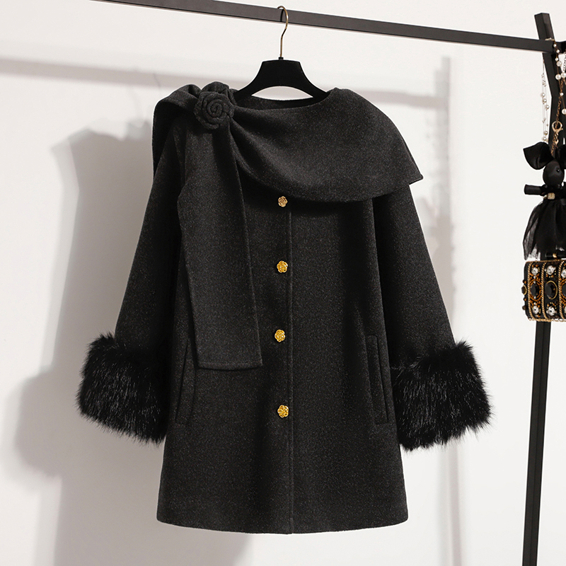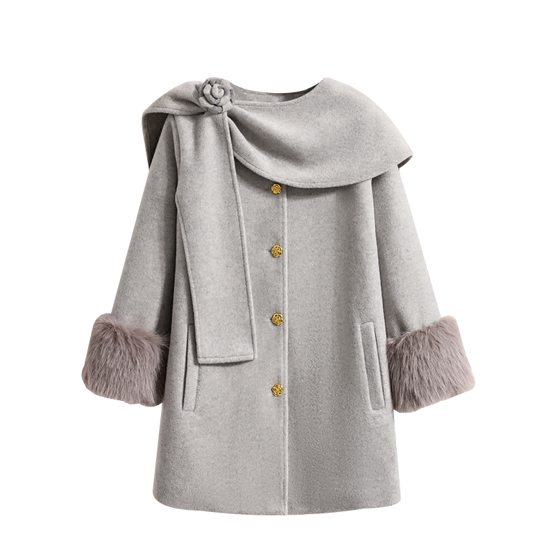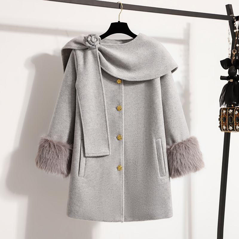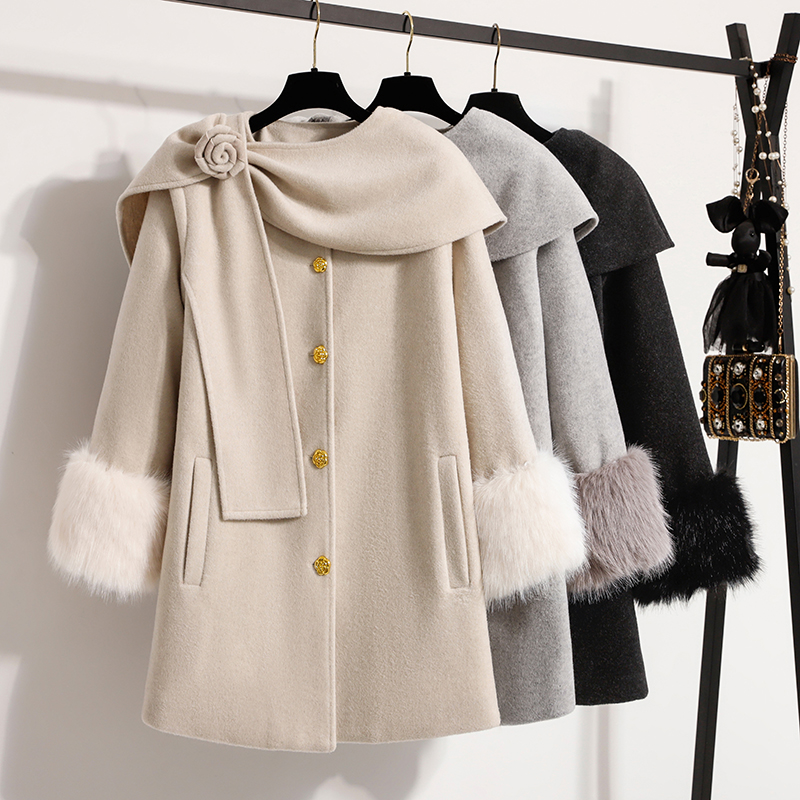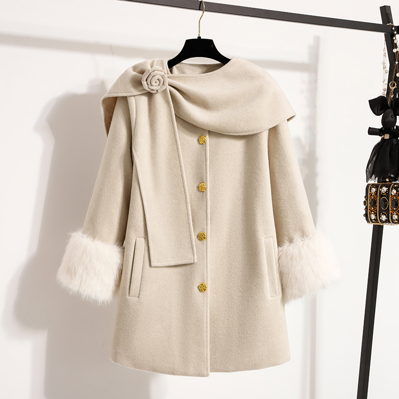 FA51166# 杨小卷富家千金狐狸毛袖羊毛白色大衣大码小香风双面呢外套 服裝批發女裝批發服飾貨源