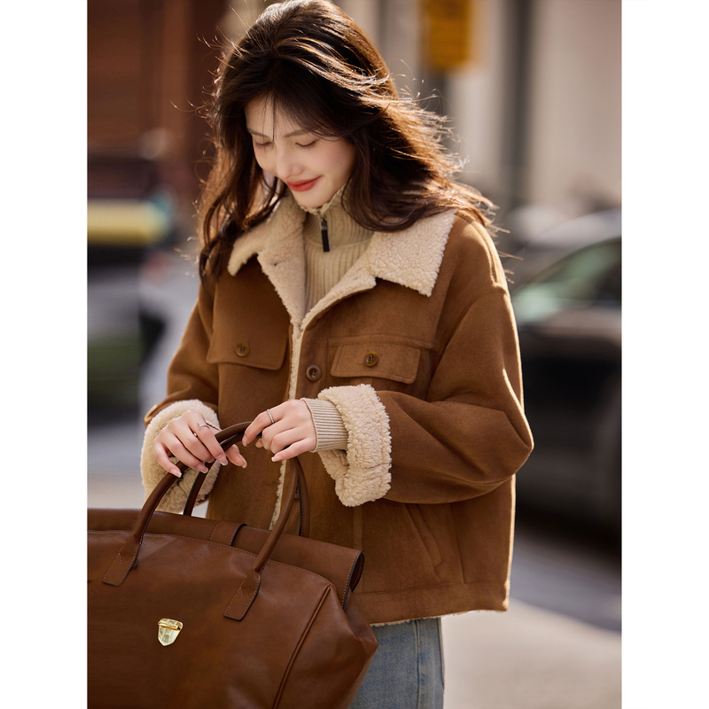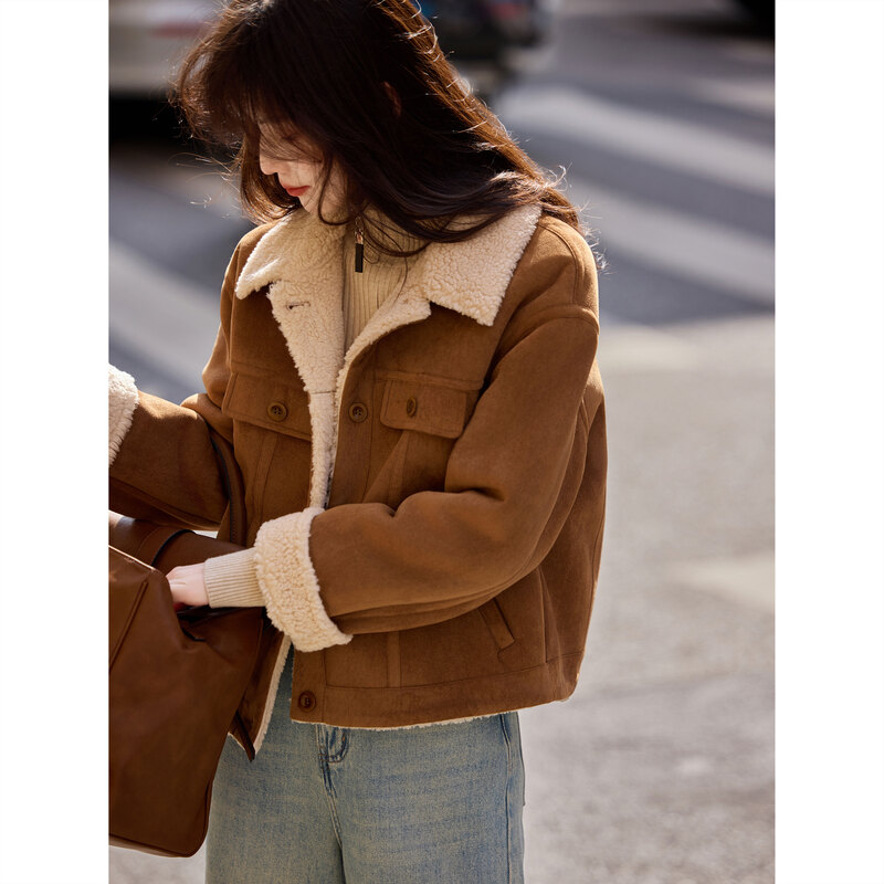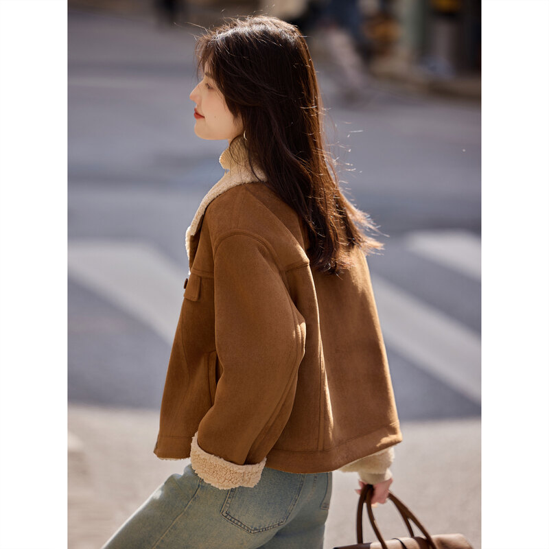 FA51477# 冬季新品法式仿羊羔毛翻领加绒加厚夹克宽松外套新款 服裝批發女裝批發服飾貨源