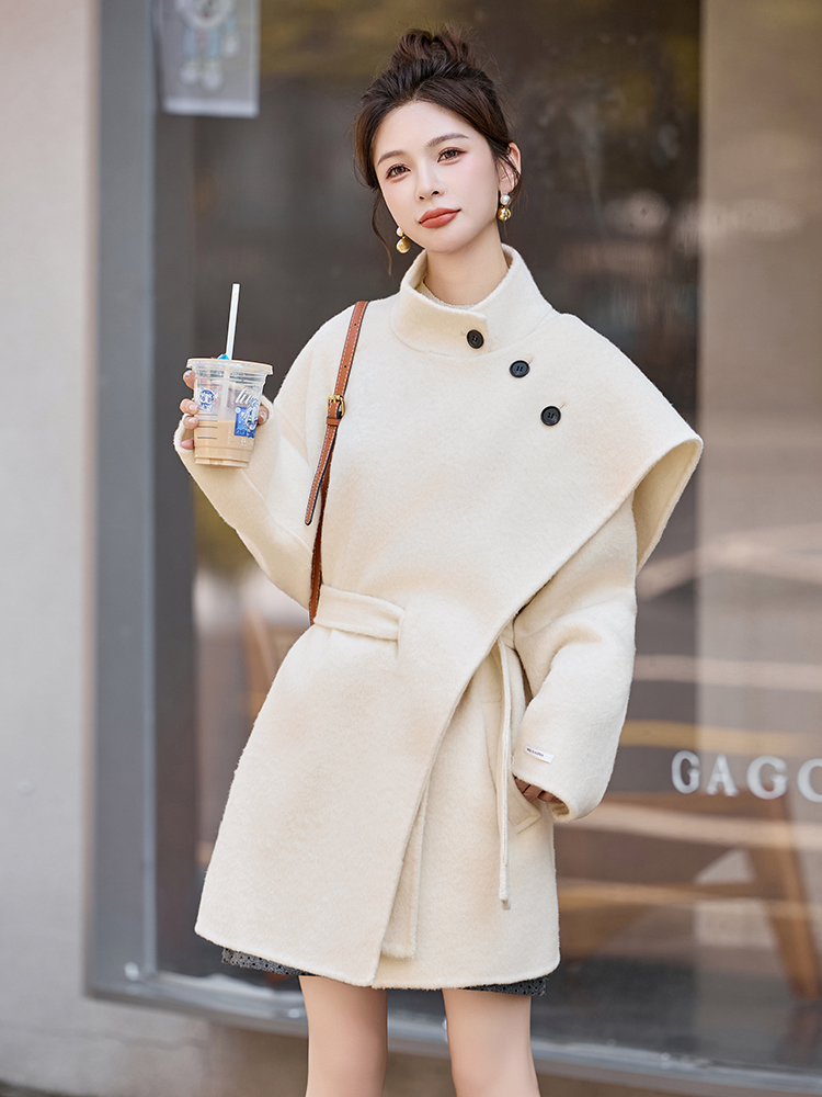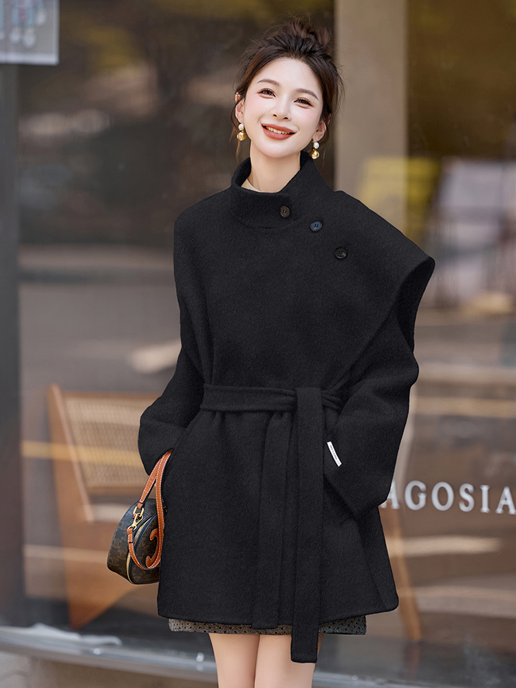 FA51478# 品质双面呢披肩双面呢大衣女秋冬新款系带收腰中长款毛呢大衣 服裝批發女裝批發服飾貨源