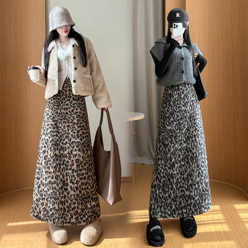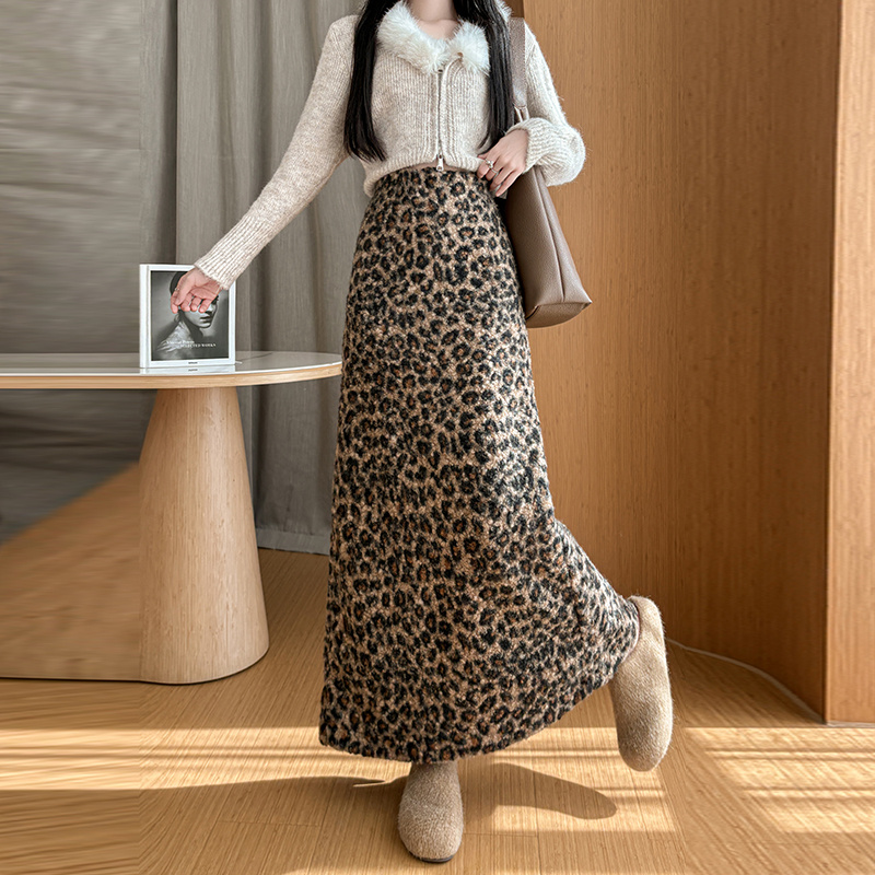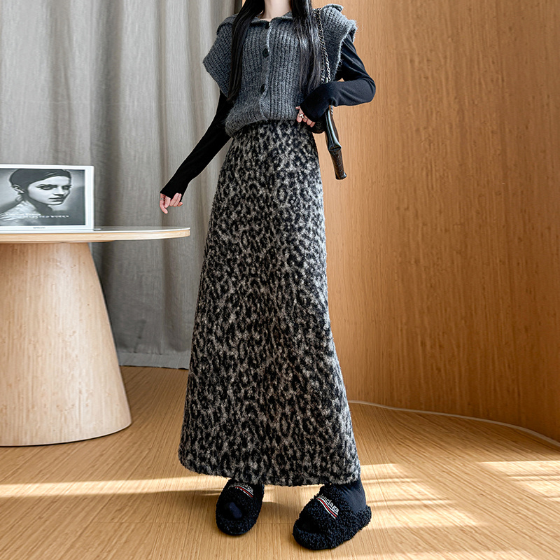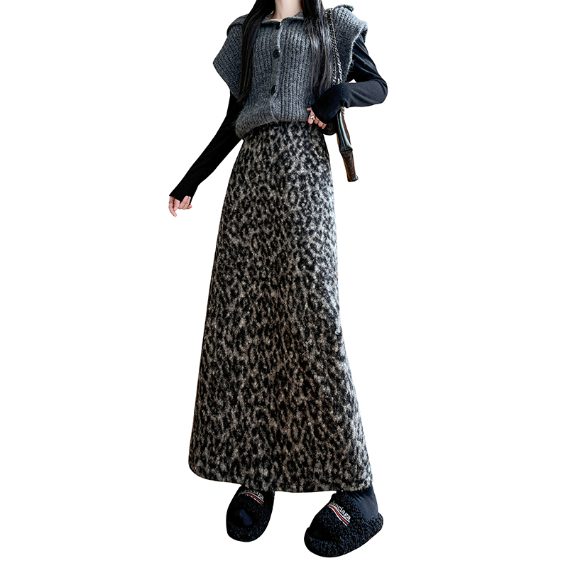 FA51788# 复古豹纹加厚半身裙女冬季高腰显瘦开叉时尚气质毛呢直筒长裙 服裝批發女裝批發服飾貨源