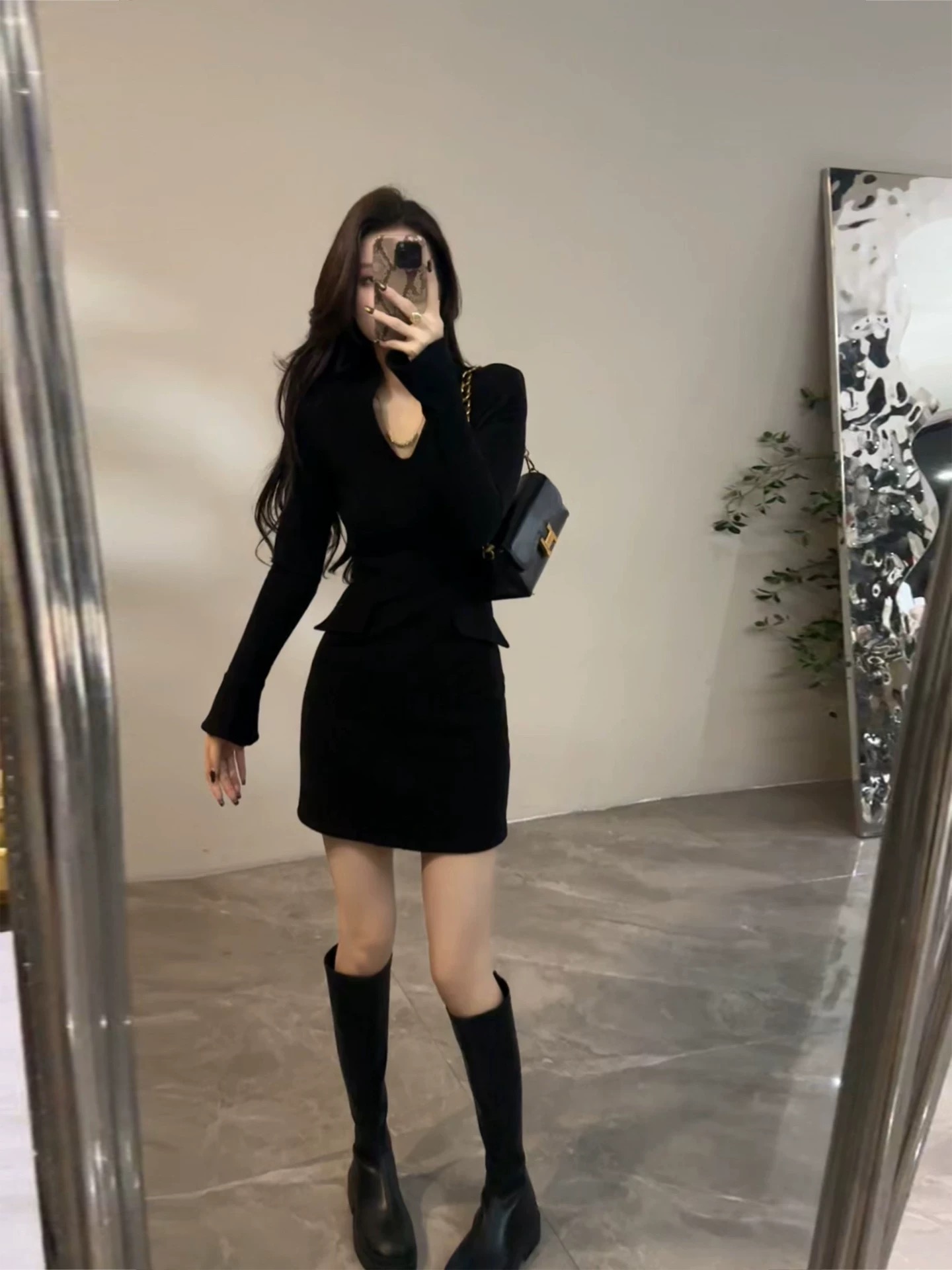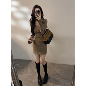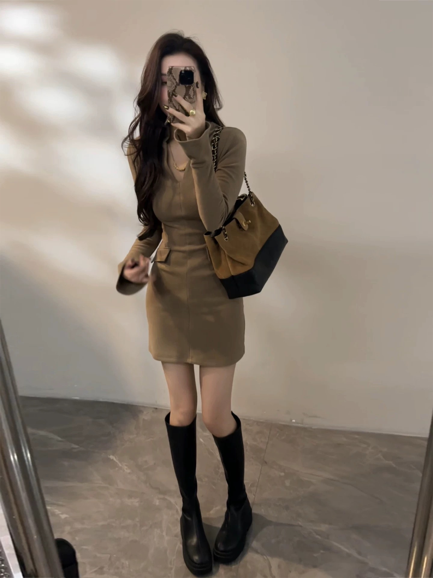 FA51790# 加绒加厚新款V领假口袋短裙设计感时髦显瘦秋冬女装连衣裙 服裝批發女裝批發服飾貨源