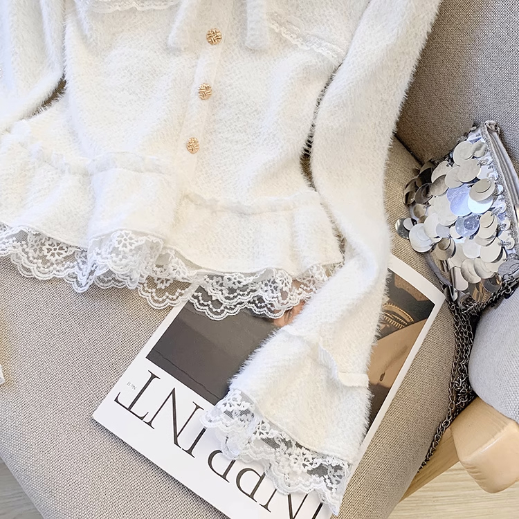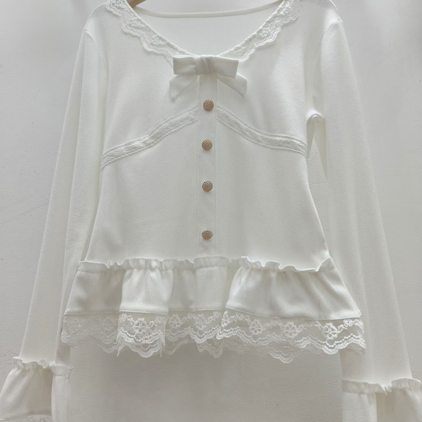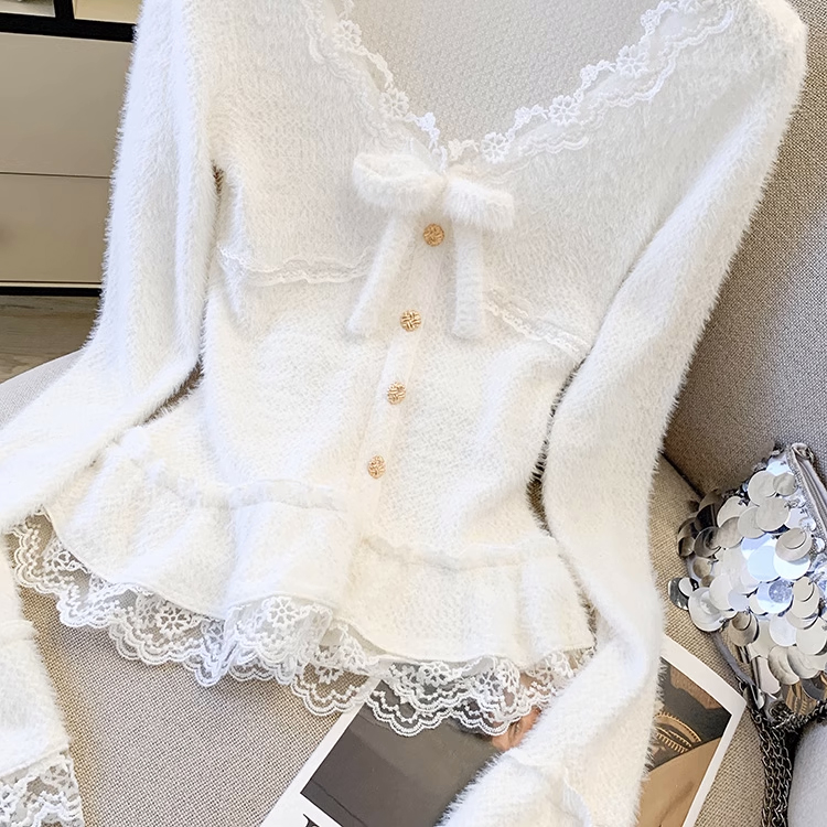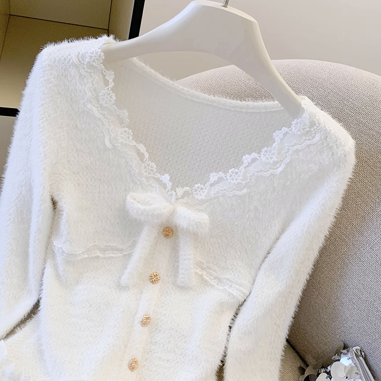 FA51803# 纯欲v领蕾丝花边打底衫冬季修身内搭蝴蝶结针织上衣圣诞节针织衫 服裝批發女裝批發服飾貨源