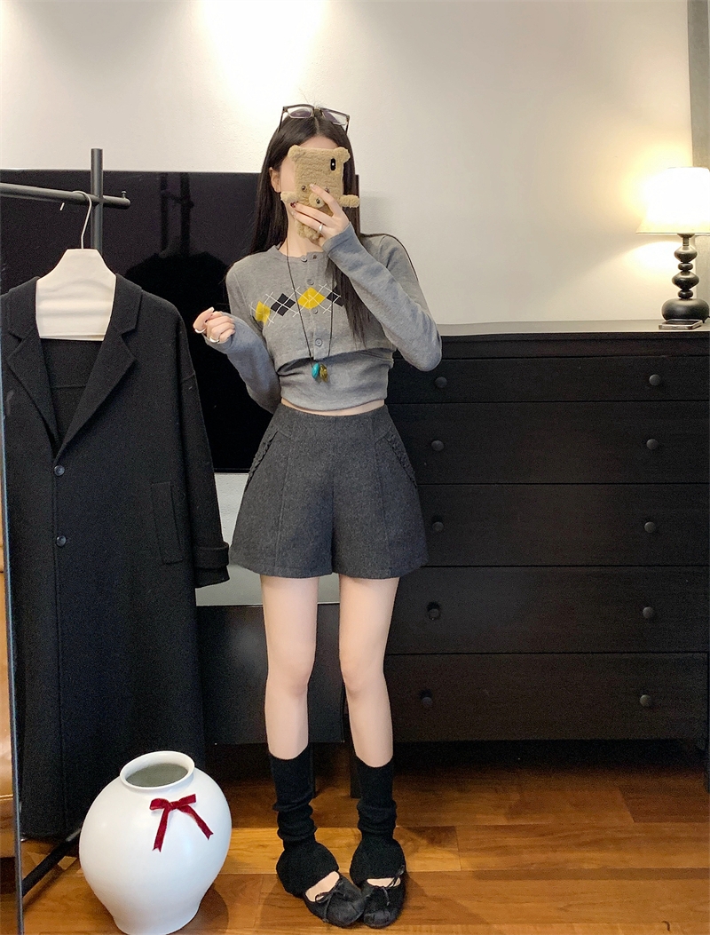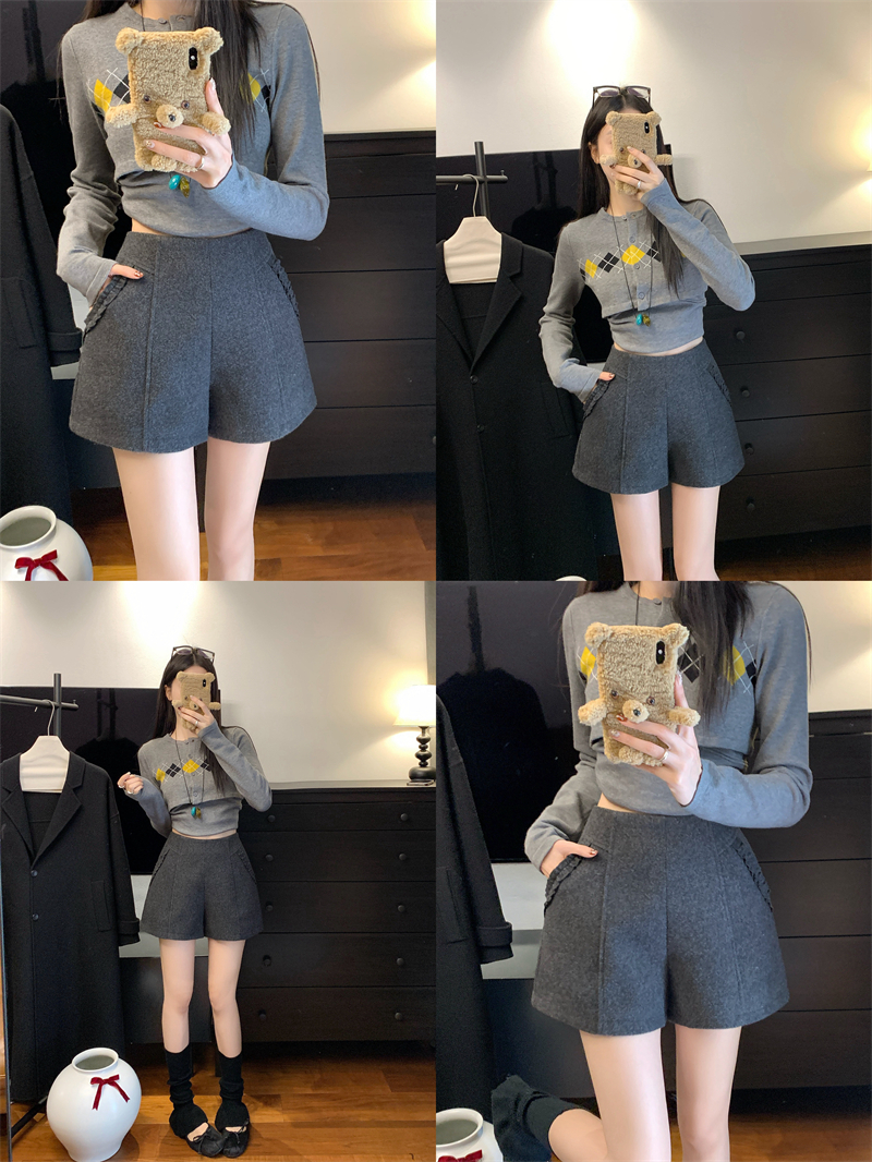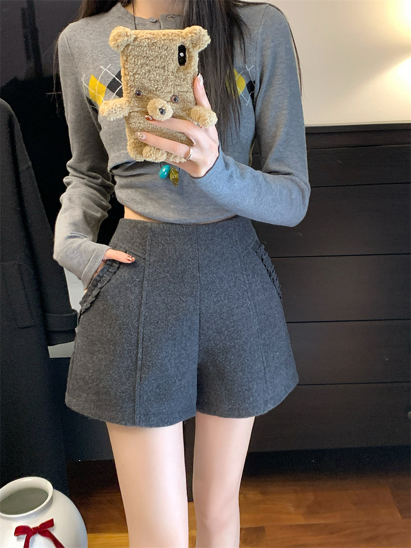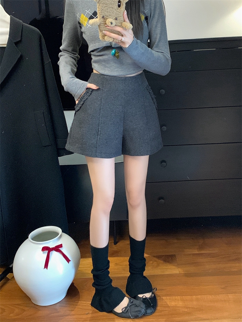 ~大码胖MM修身高腰木耳边口袋呢料短款裙裤 服裝批發女裝批發服飾貨源