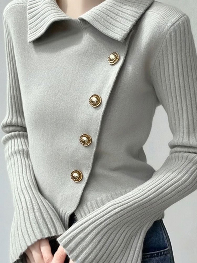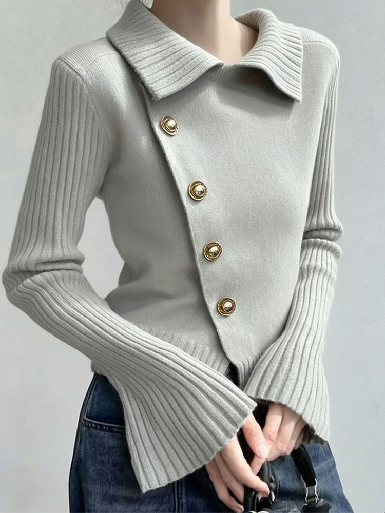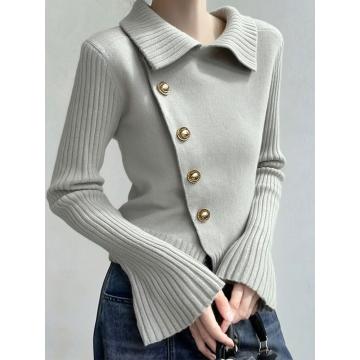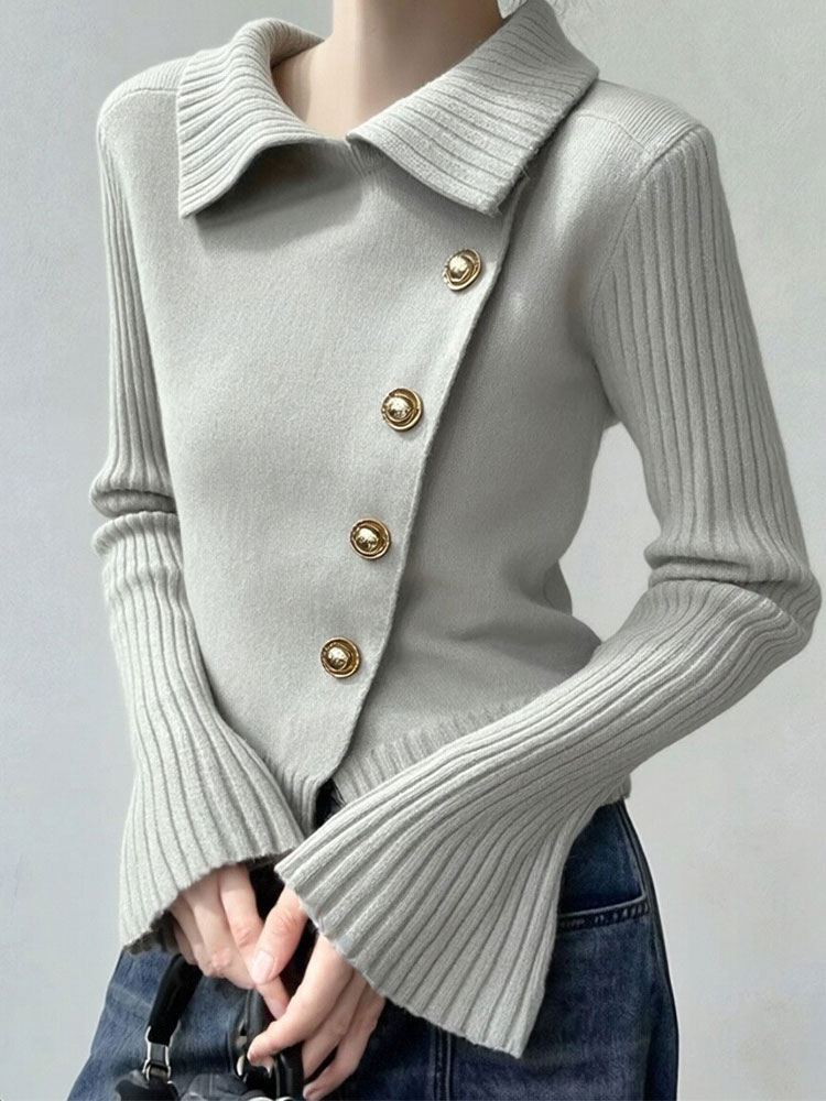 氛围感小众穿搭灰色翻领斜扣针织衫女秋冬新款设计感百搭毛衣 服裝批發女裝批發服飾貨源