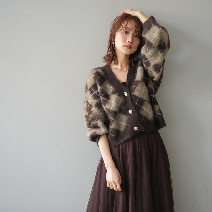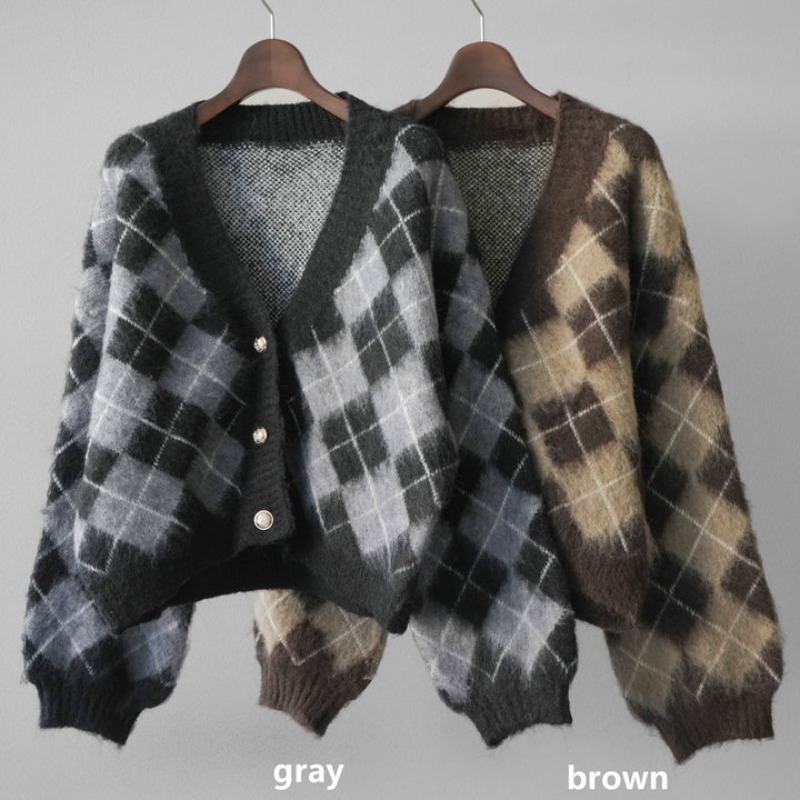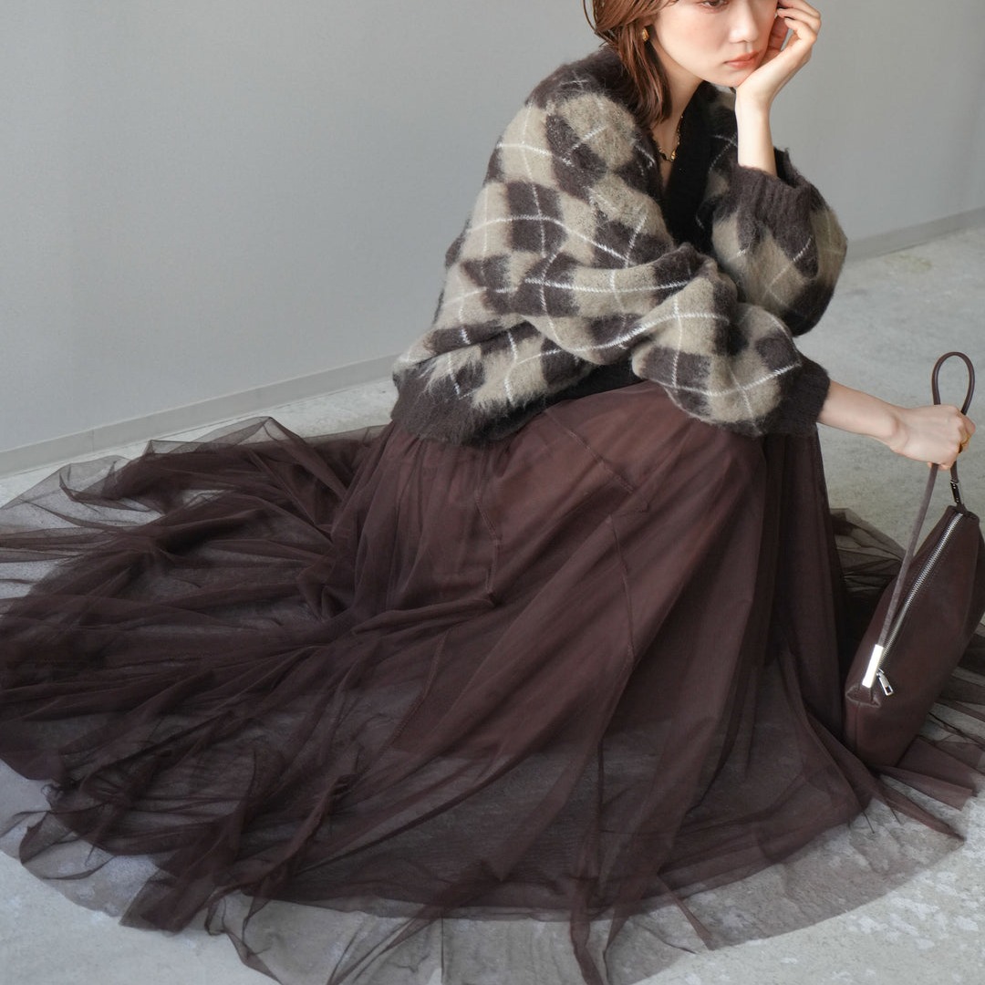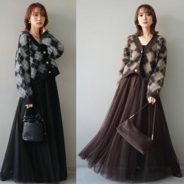 FA52428# 春秋新款V领格子毛衣开衫+半身大摆网纱长裙两件套套装 服裝批發女裝批發服飾貨源