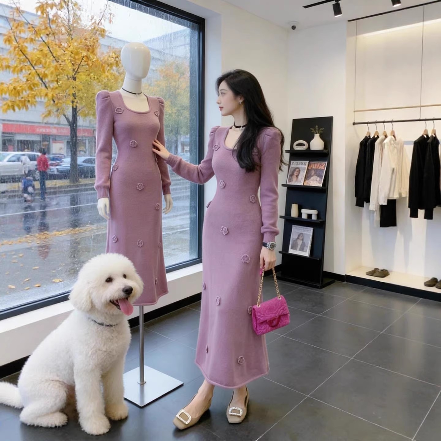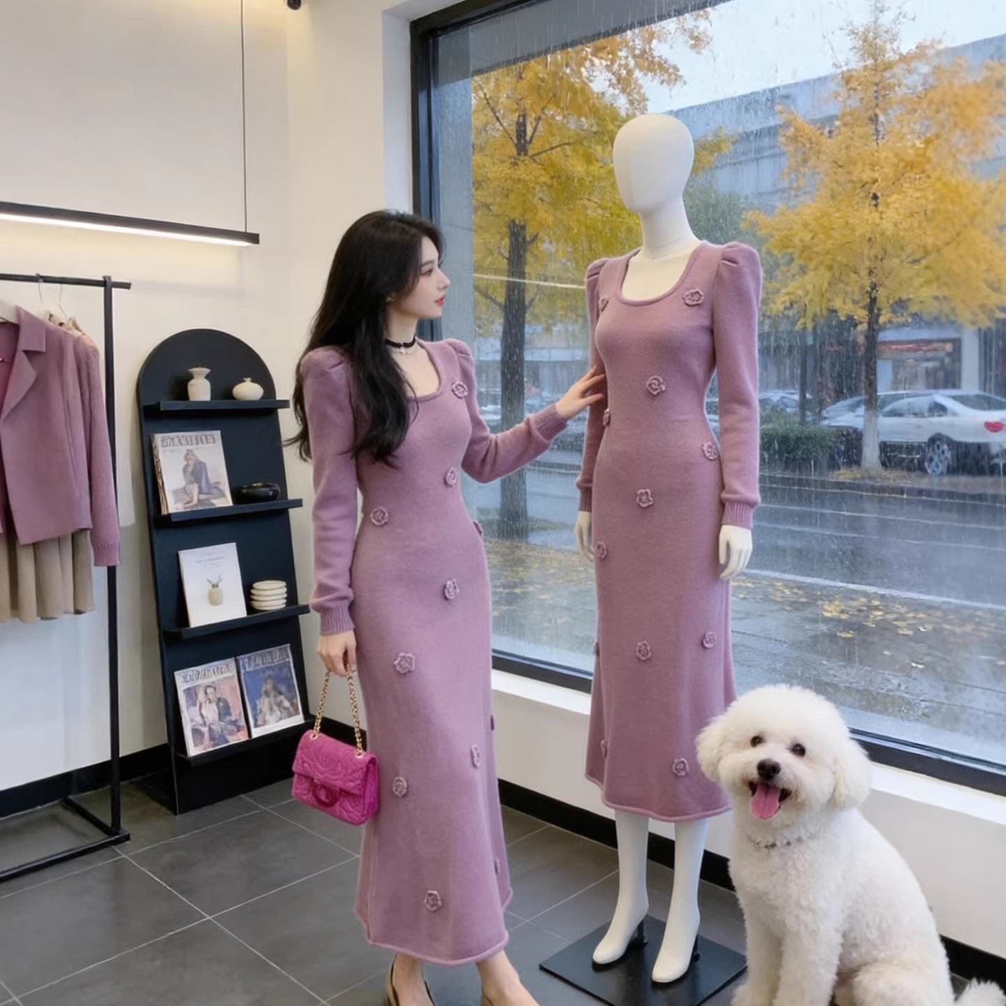法式紫色针织连衣裙女秋冬新款高级感泡泡袖收腰显瘦洋气长裙