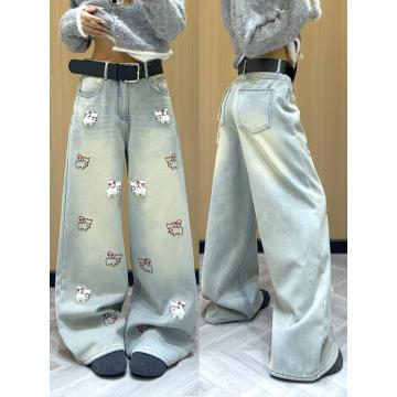 FA52659# 设计感猫咪刺绣水洗牛仔裤女冬季新款春款不加绒宽松阔腿拖地裤 服裝批發女裝批發服飾貨源