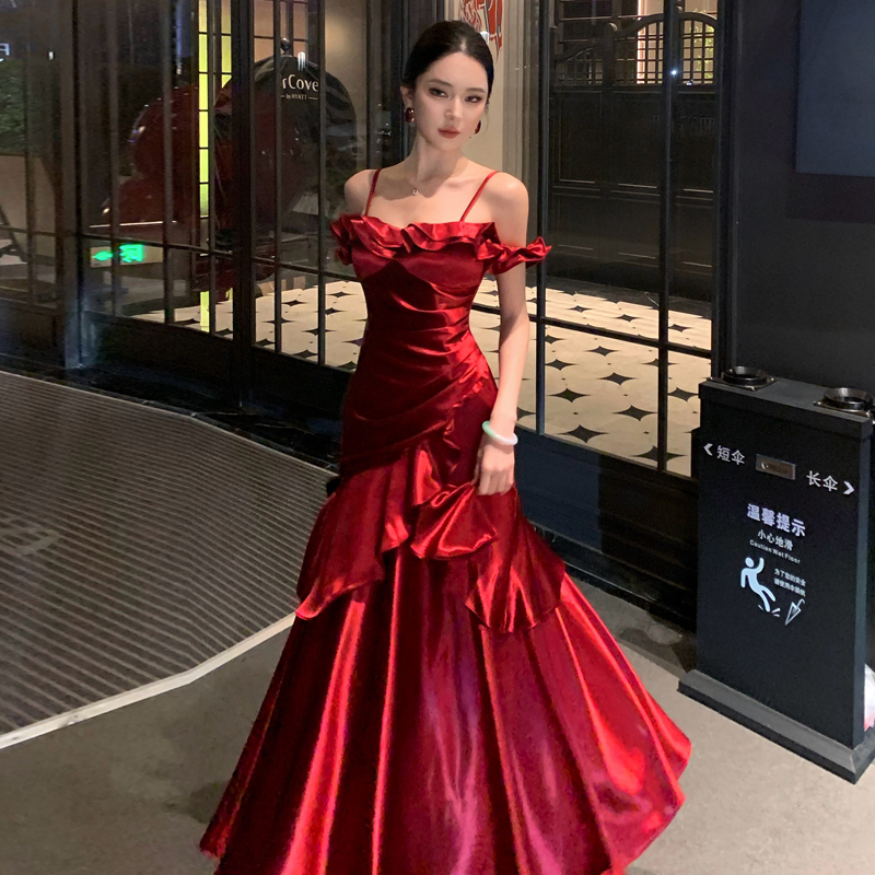 FA52684# 热恋红酒法式缎面一字肩红色吊带连衣裙女荷叶边礼服 服裝批發女裝批發服飾貨源
