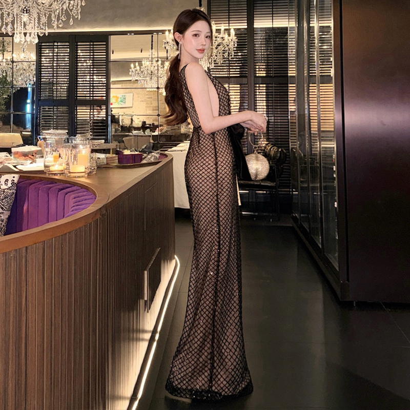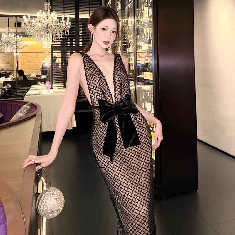 FA52685# 欧美风性感连衣裙亮片大蝴蝶结深V领轻礼服轻奢长裙 服裝批發女裝批發服飾貨源