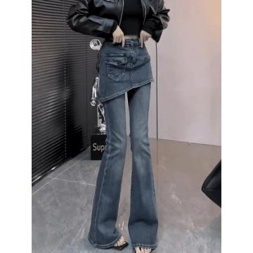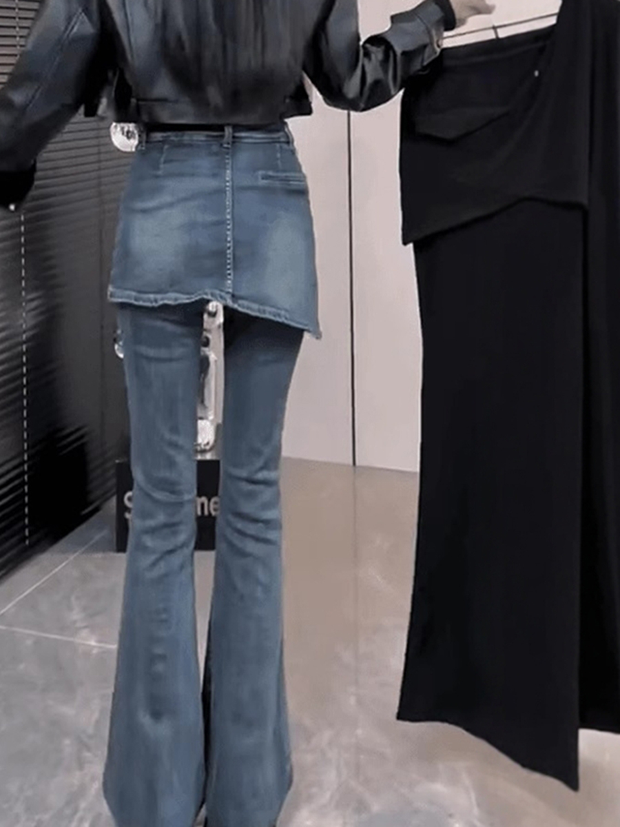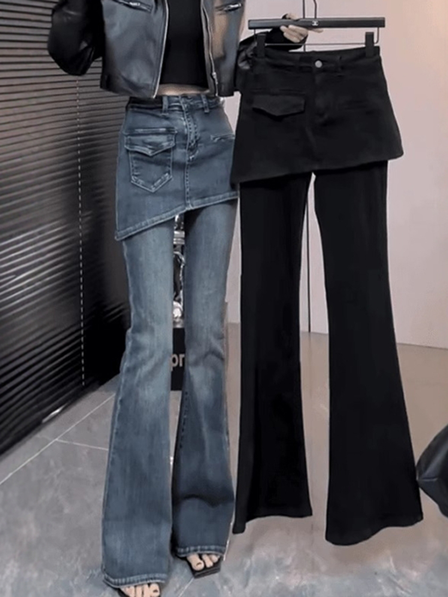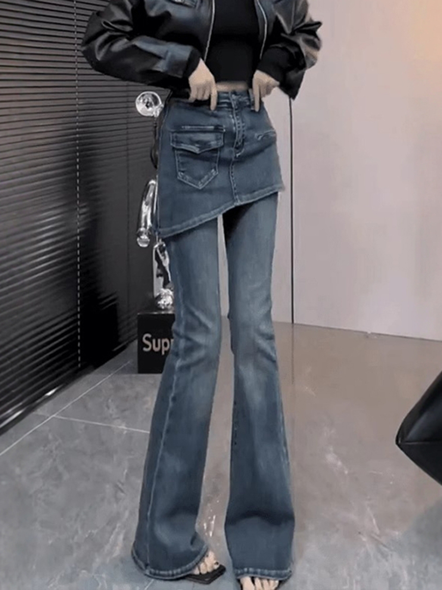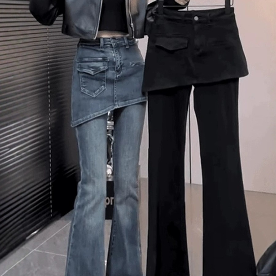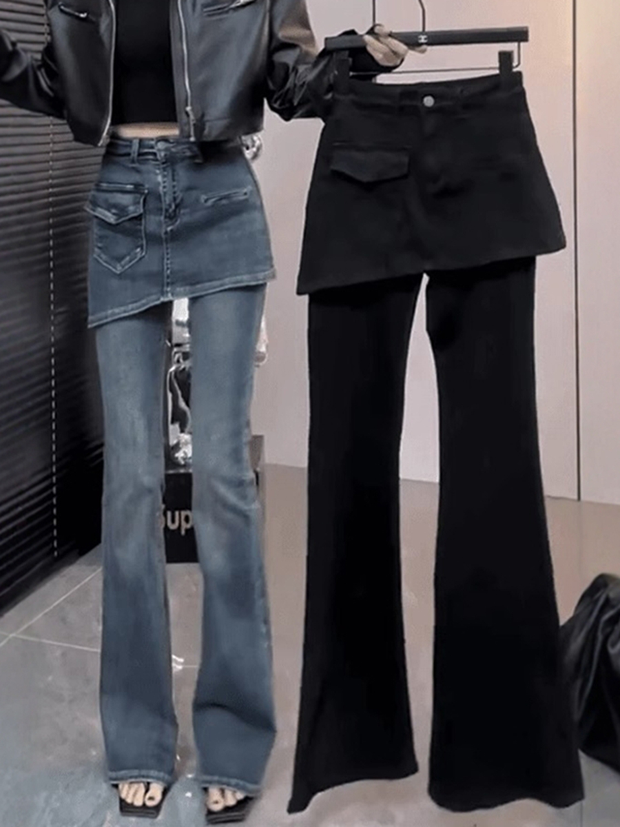 FA52741# 大码复古遮肉假两件微喇牛仔裤女秋冬新款高腰显瘦加绒马蹄裤 服裝批發女裝批發服飾貨源