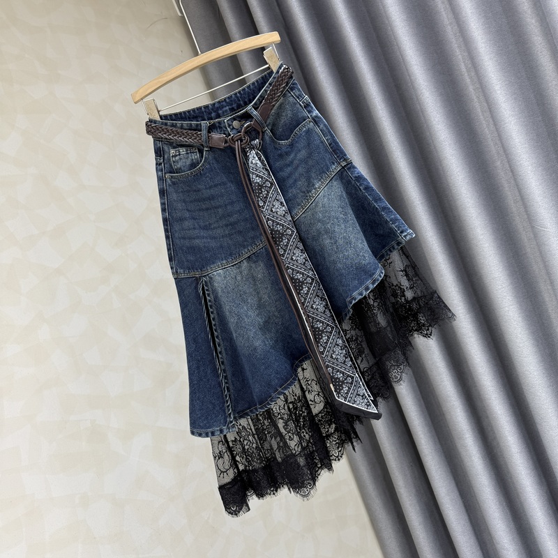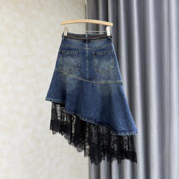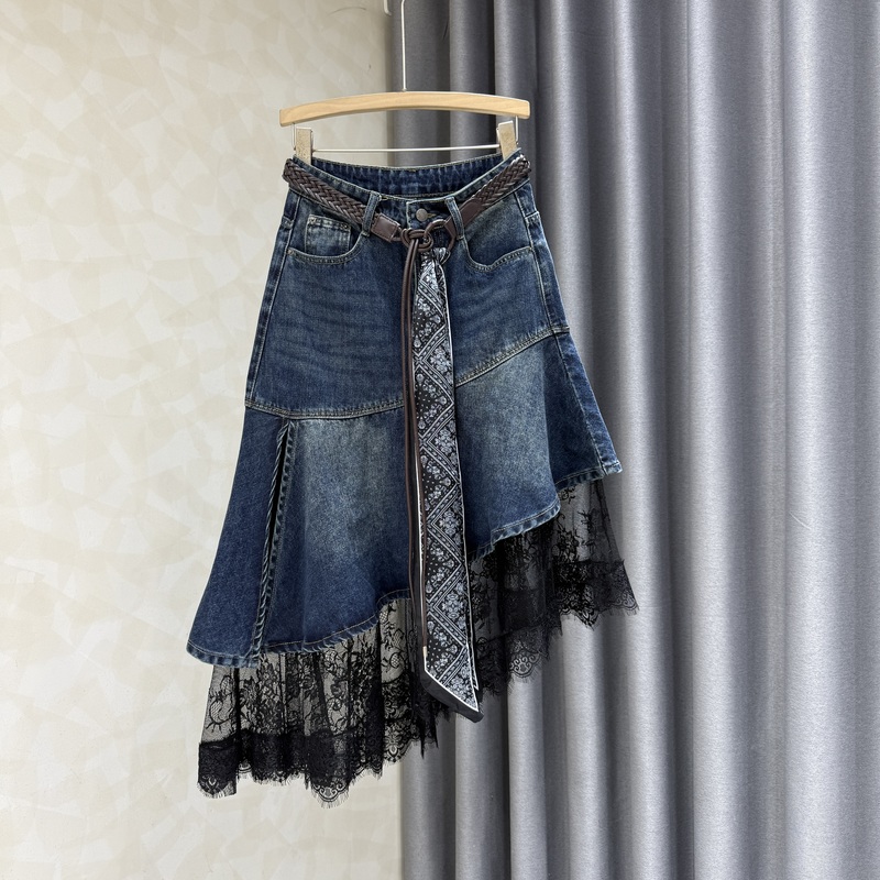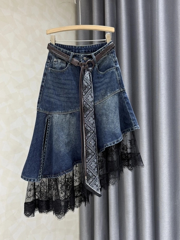 FA52759# 美式设计感不规则蕾丝拼接牛仔半身裙女春秋新款高腰显瘦A字裙子 服裝批發女裝批發服飾貨源
