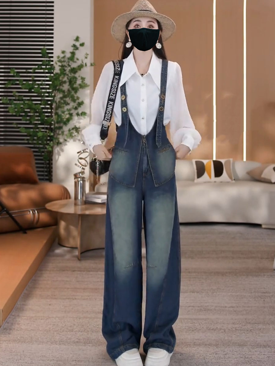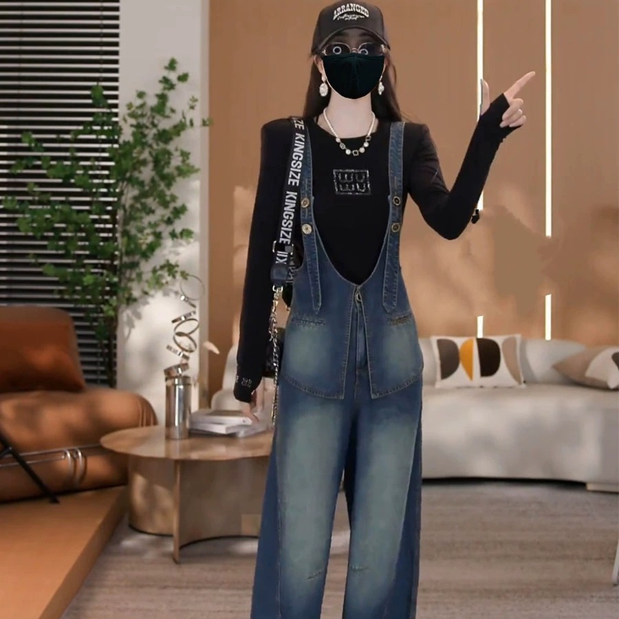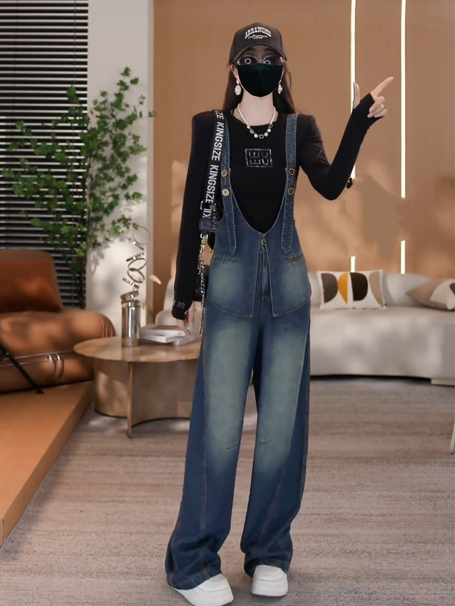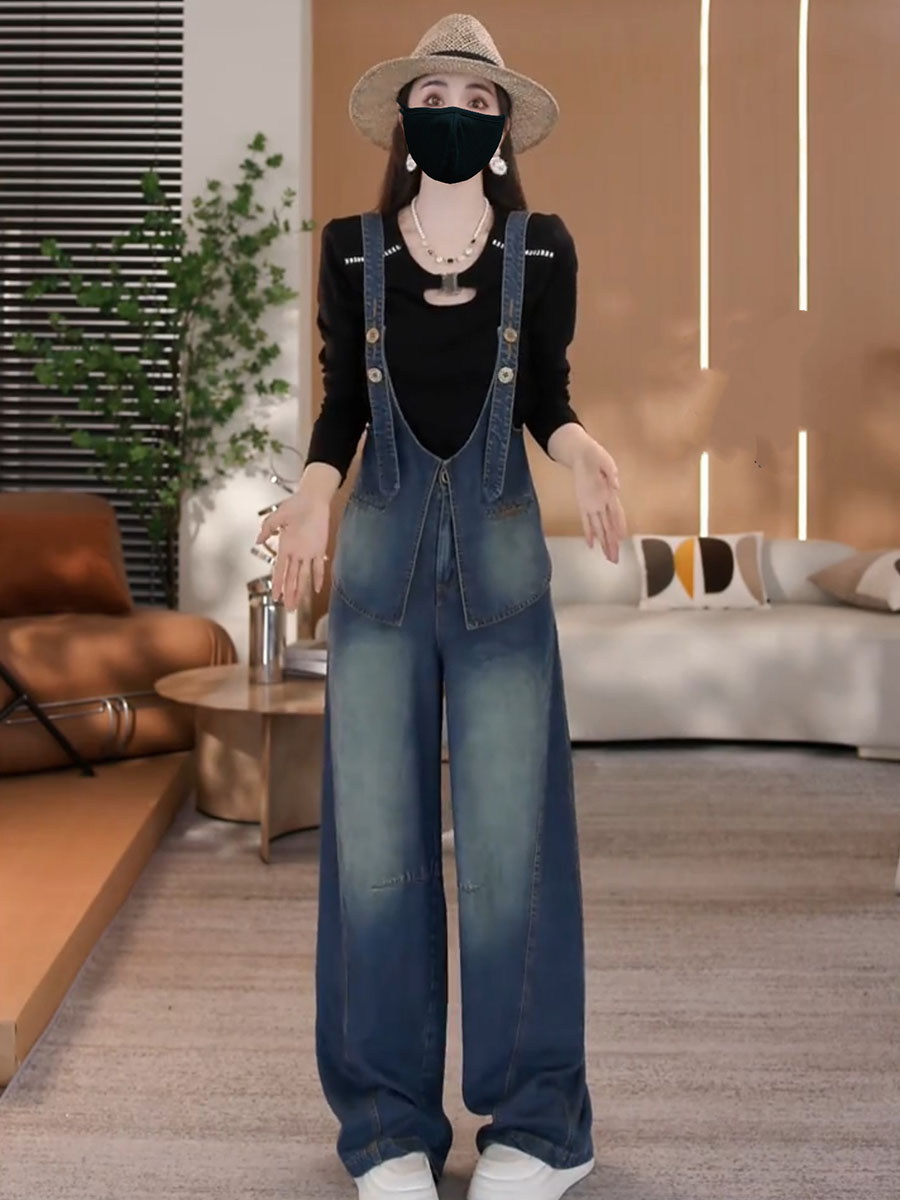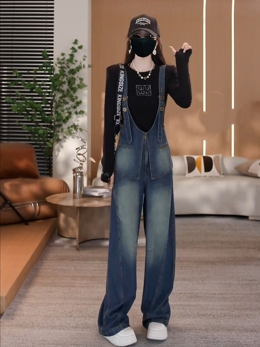 FA52762# 好显瘦的秋季设计感遮肚显瘦牛仔背带裤女新款气质阔腿长裤潮 服裝批發女裝批發服飾貨源