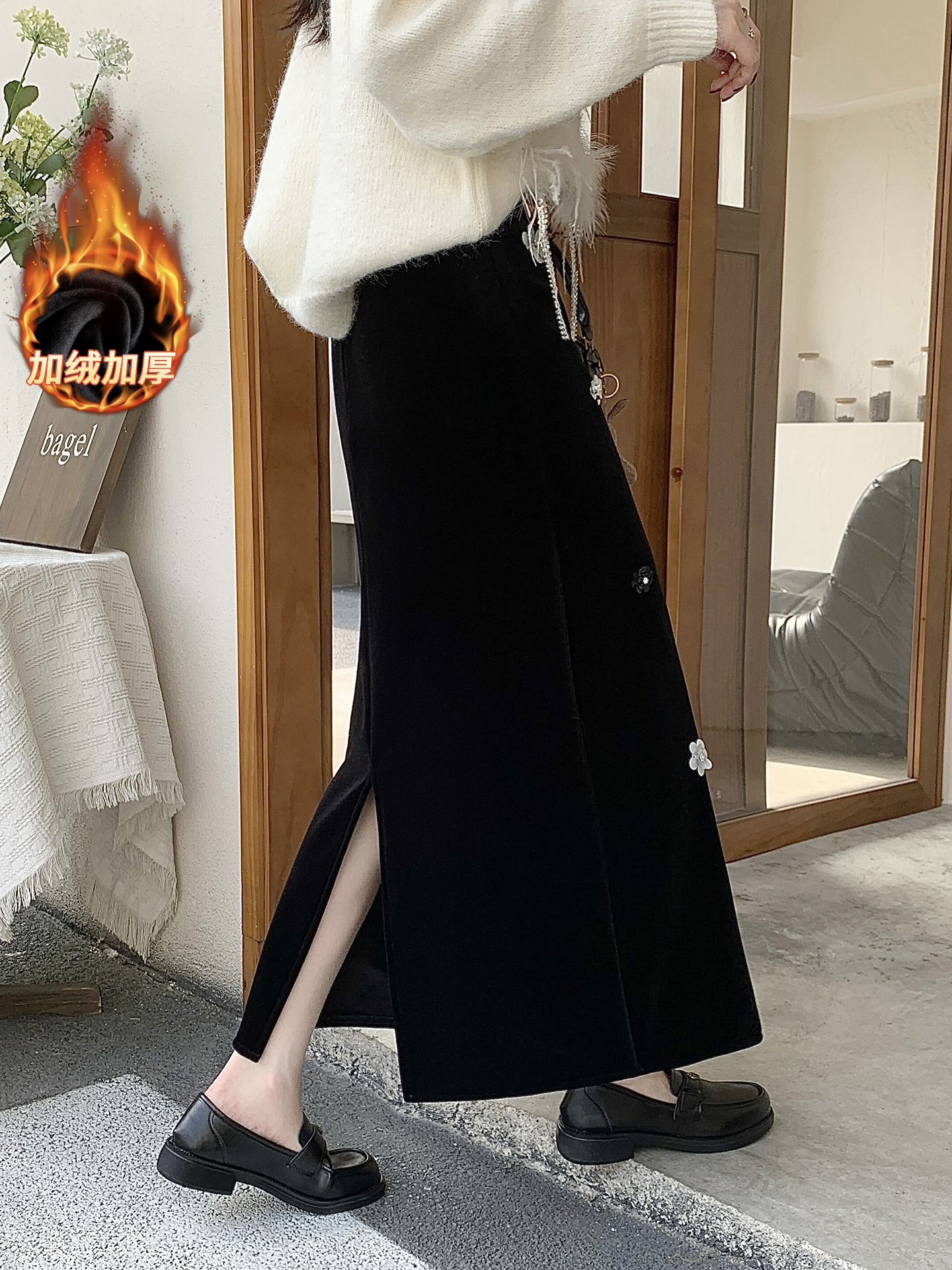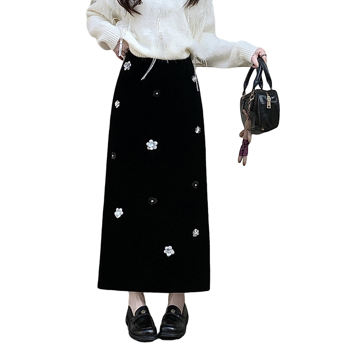 FA52800# 秋冬高定手工坊立体定位定珠黑色直筒丝绒开叉半身裙 服裝批發女裝批發服飾貨源