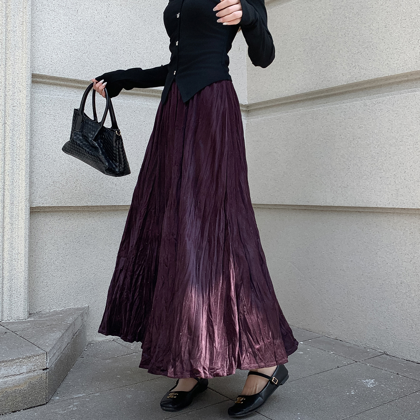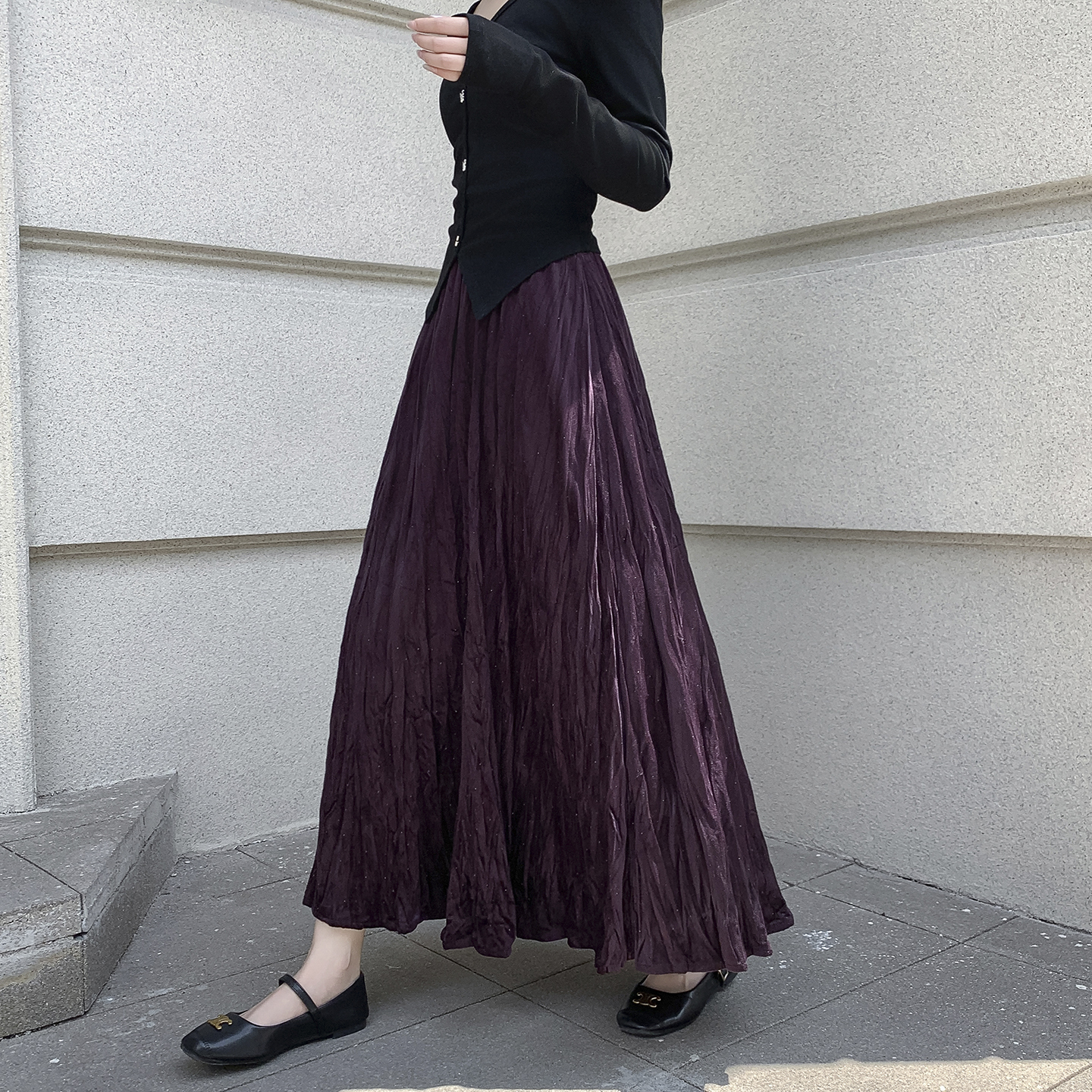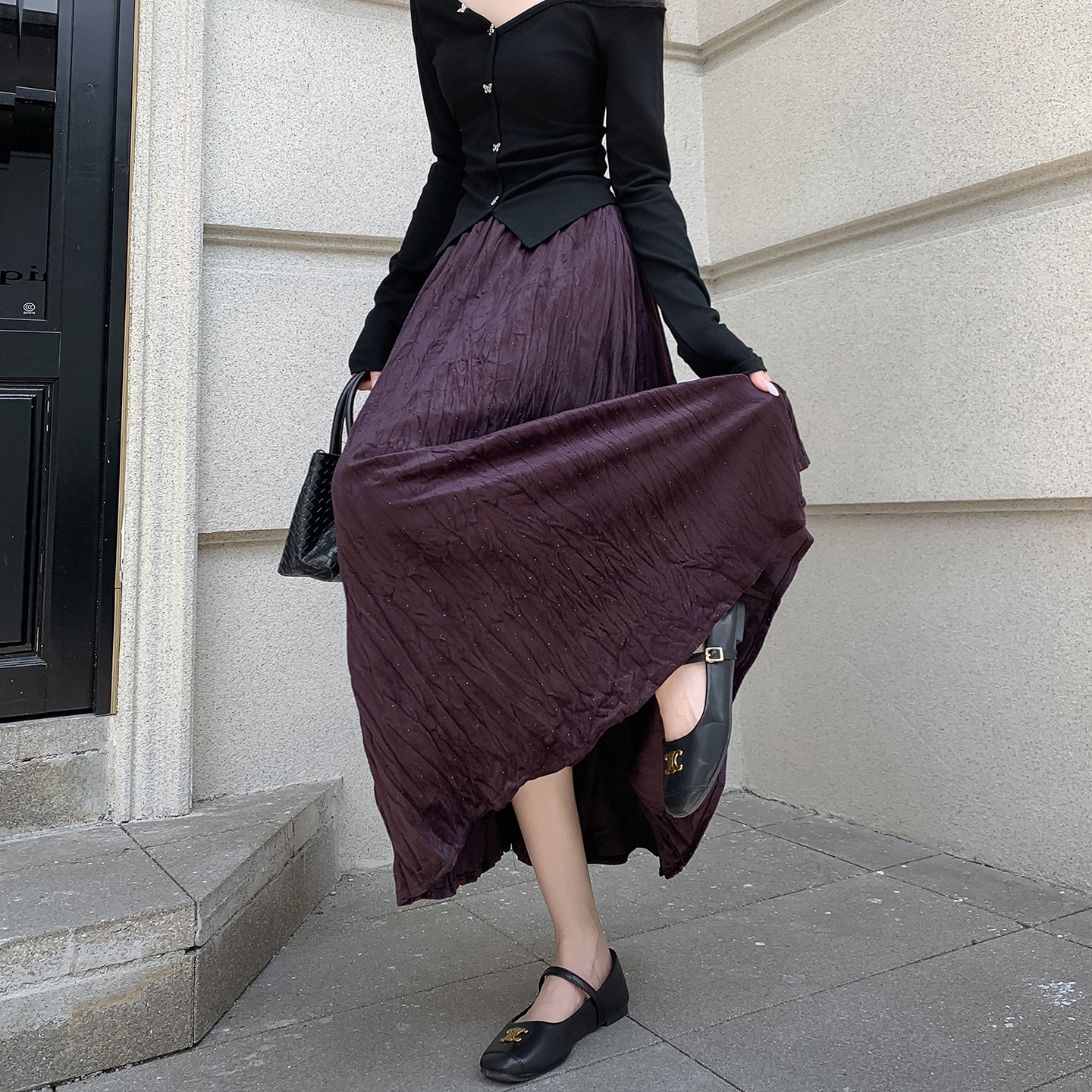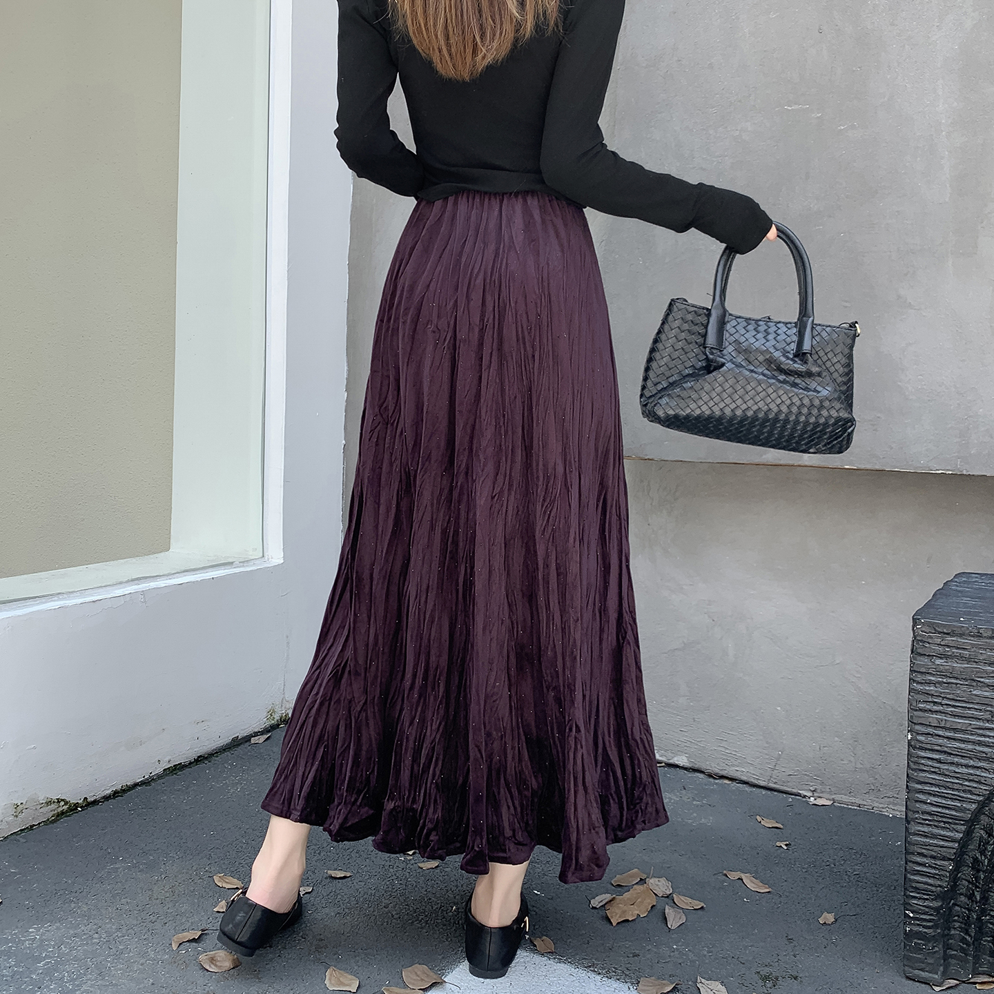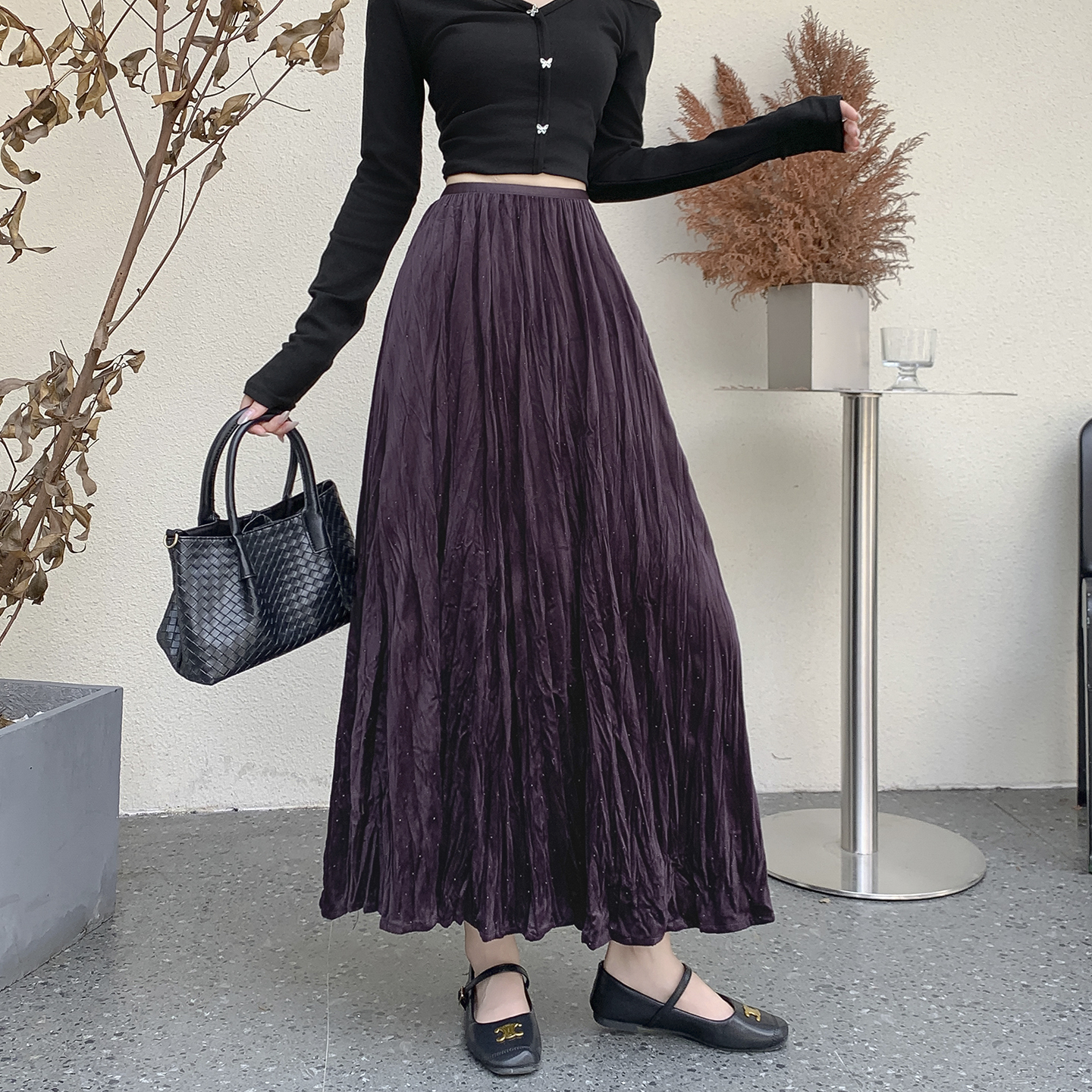 FA52802# 褶皱烫钻丝绒半身裙简约肌理感压折大摆裙宽松A字半裙中长款 服裝批發女裝批發服飾貨源