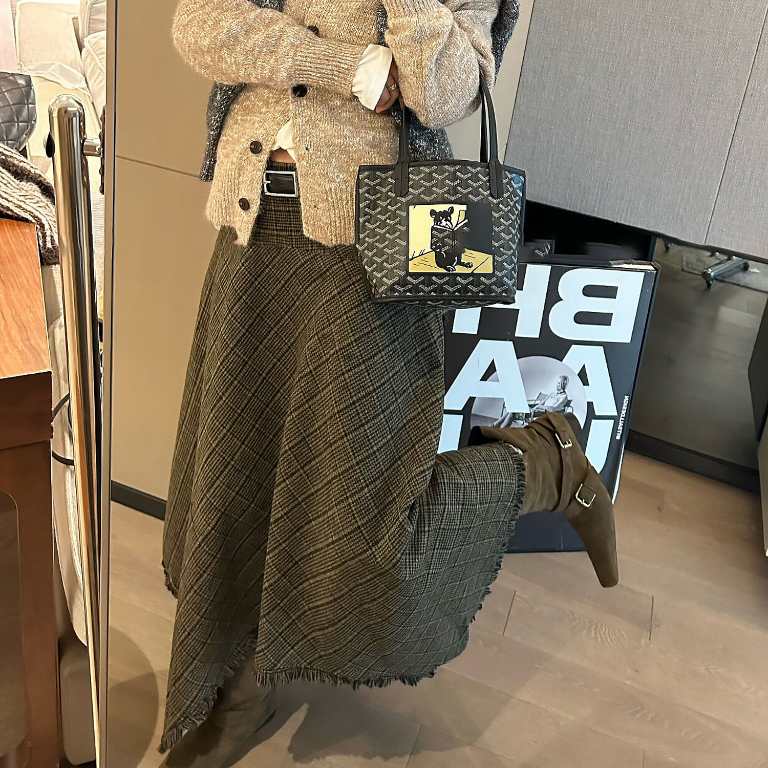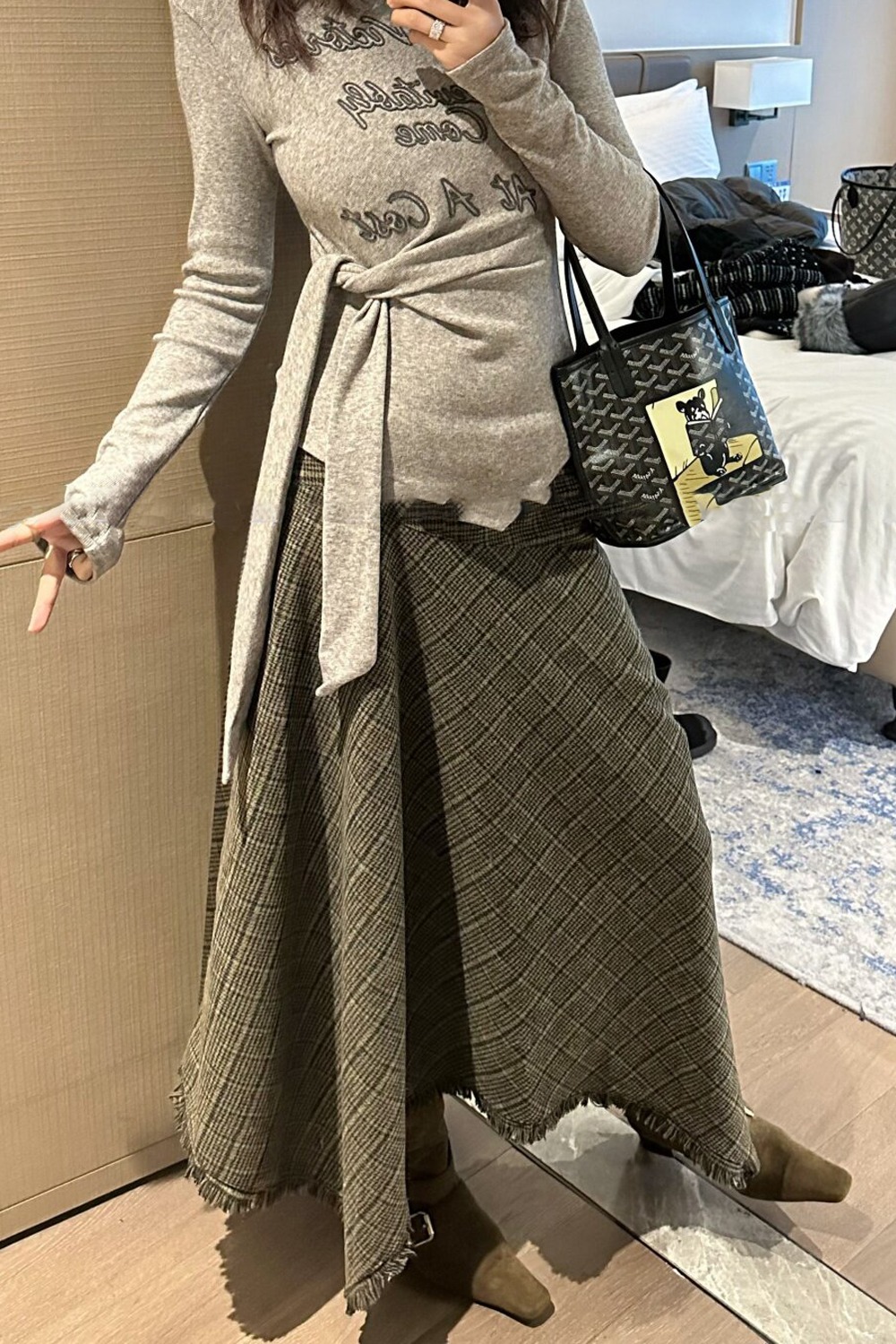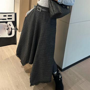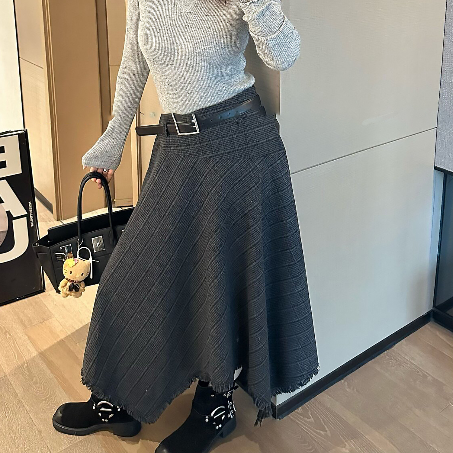 FA52822# 复古气质宽松格子流苏半身裙女冬春新款不规则下摆a字中长裙 服裝批發女裝批發服飾貨源