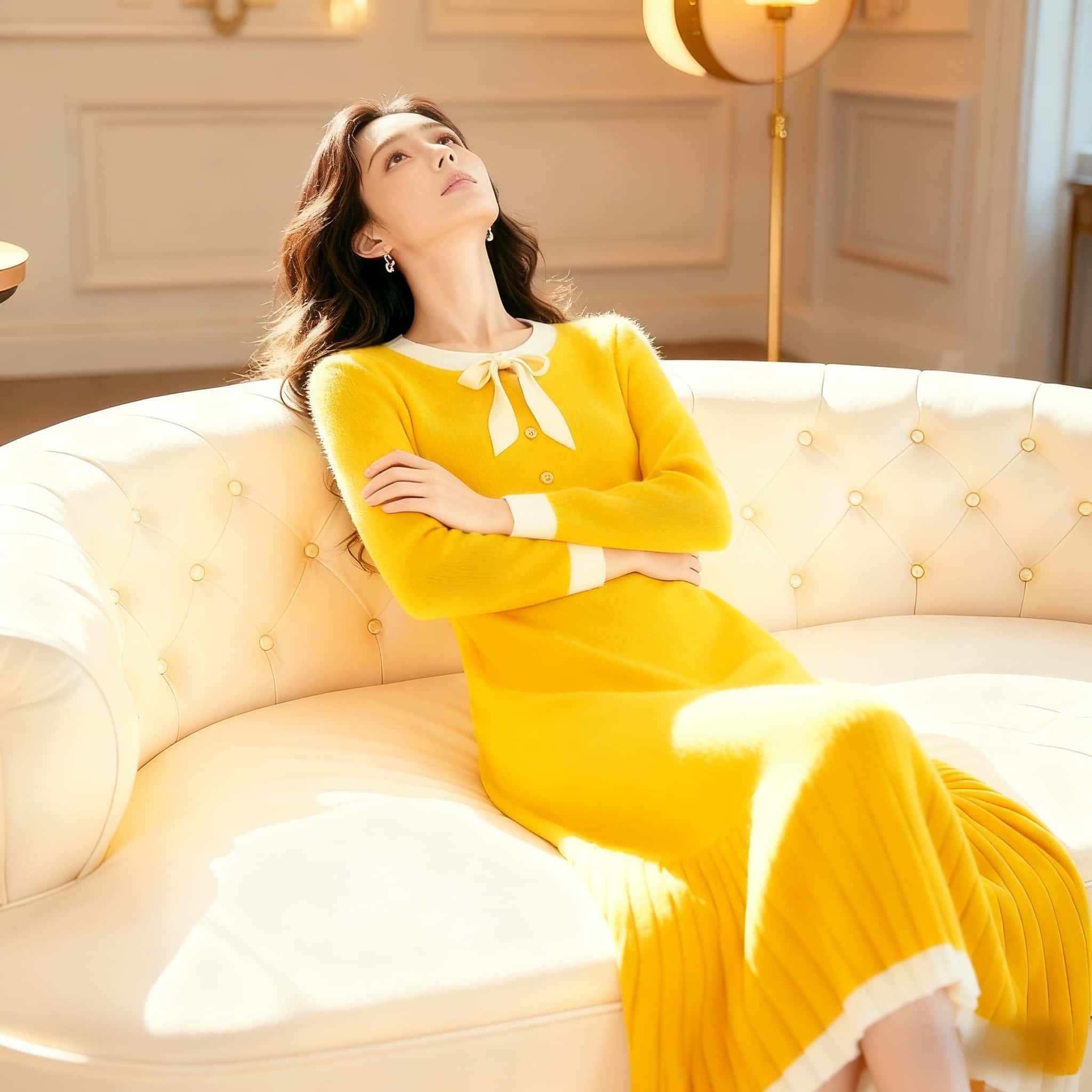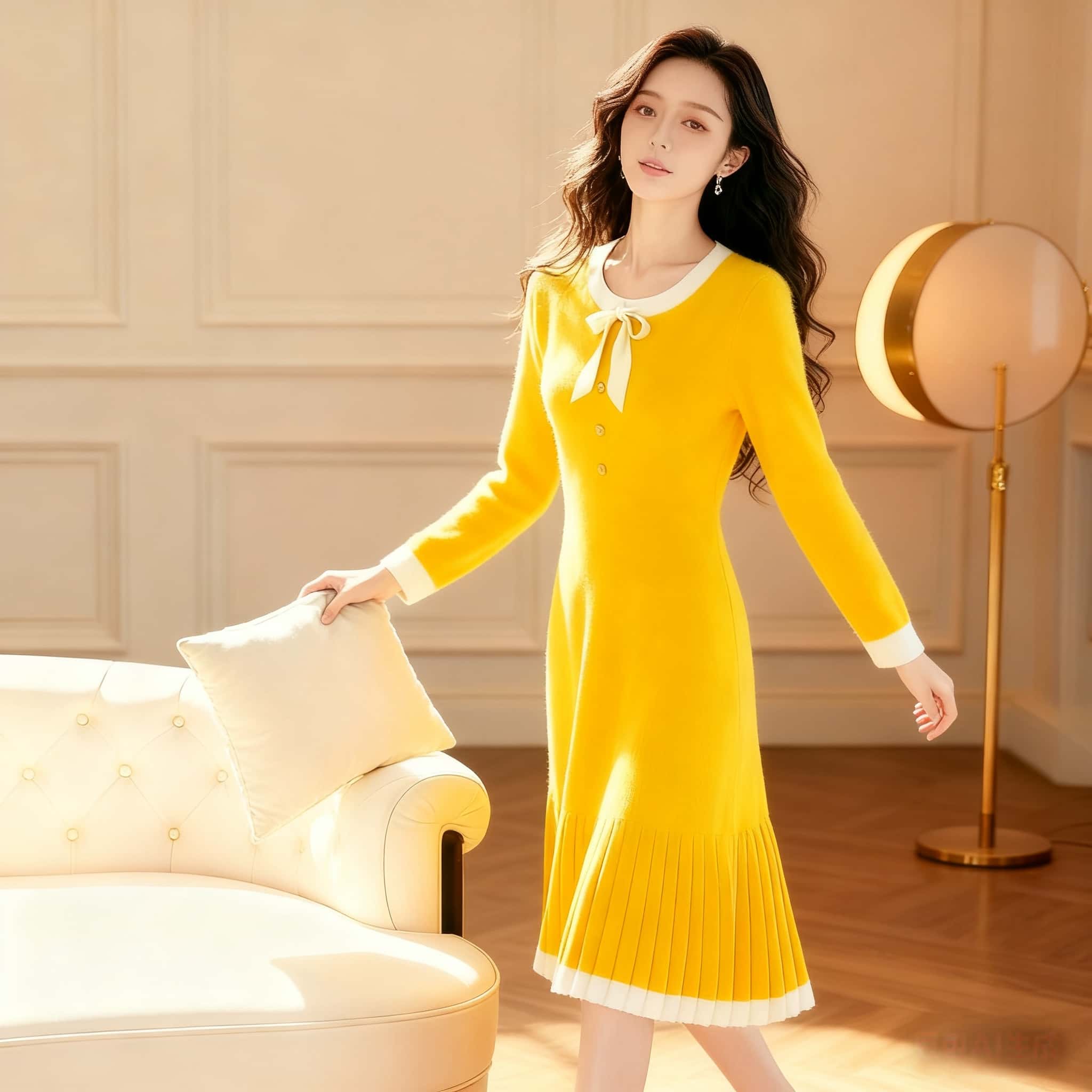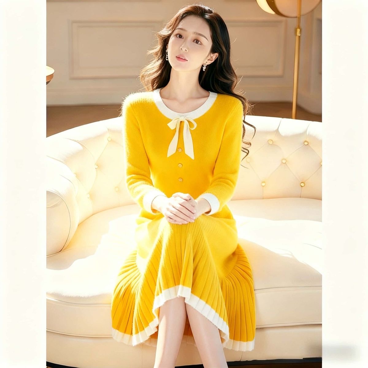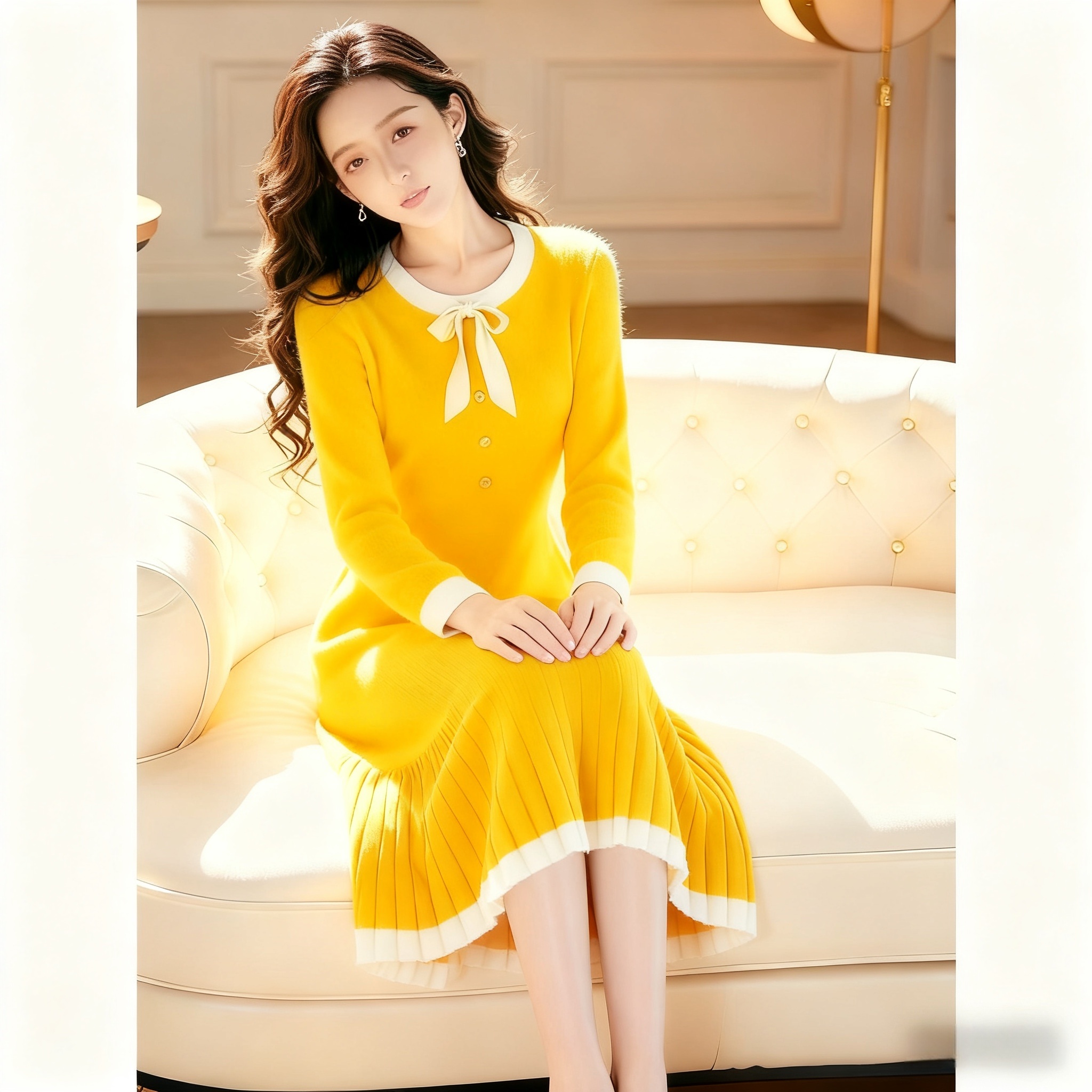 FA52888# 法式小香风收腰黄色毛衣连衣裙外穿冬季加厚内搭打底针织裙子 服裝批發女裝批發服飾貨源