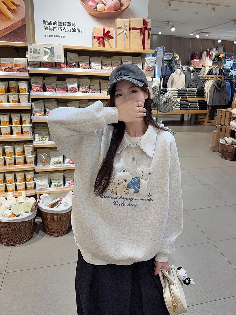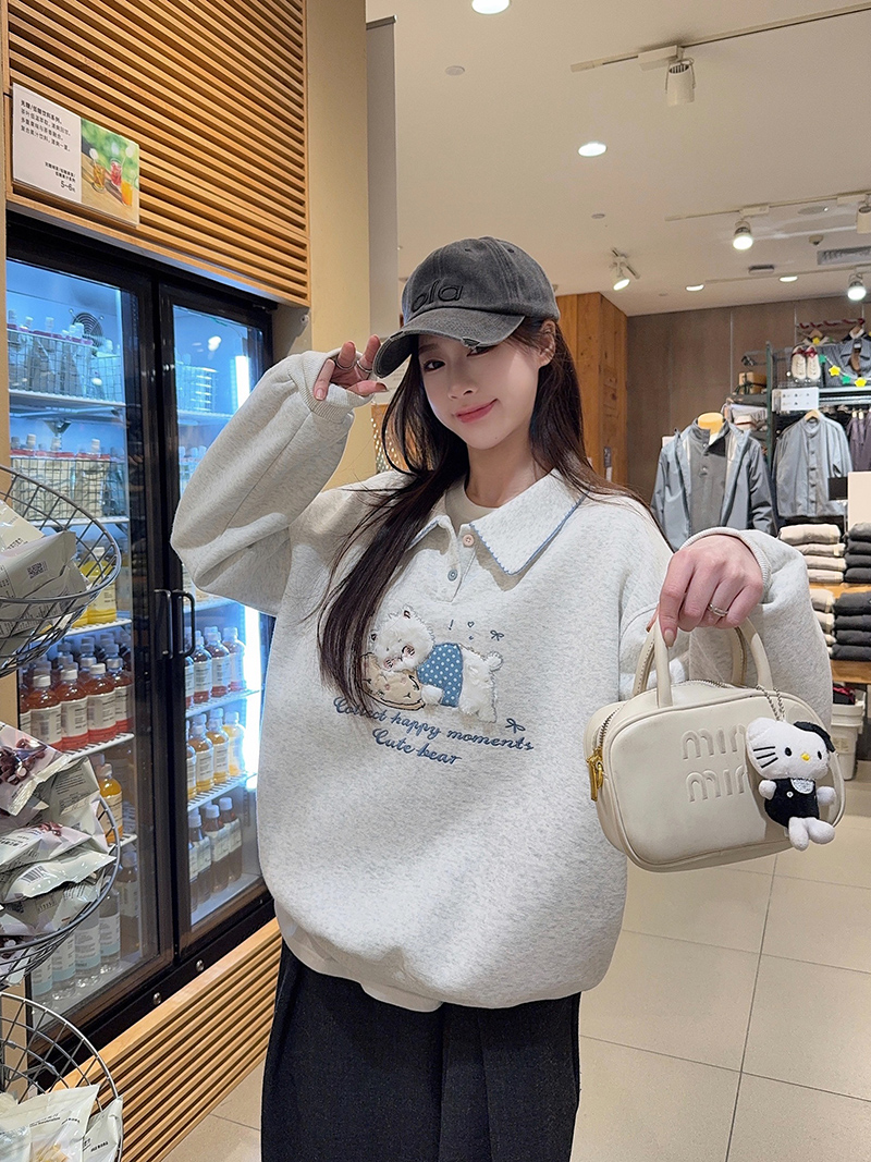 纯棉华棉复合真超加绒卫衣女宽松卡通刺绣POLO领保暖上衣 服裝批發女裝批發服飾貨源