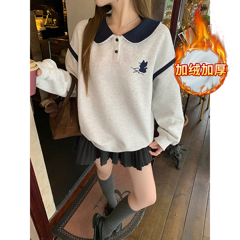 加绒卫衣秋冬新款初中生学生中长宽松刺绣娃娃领保暖上衣 服裝批發女裝批發服飾貨源