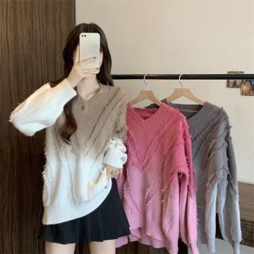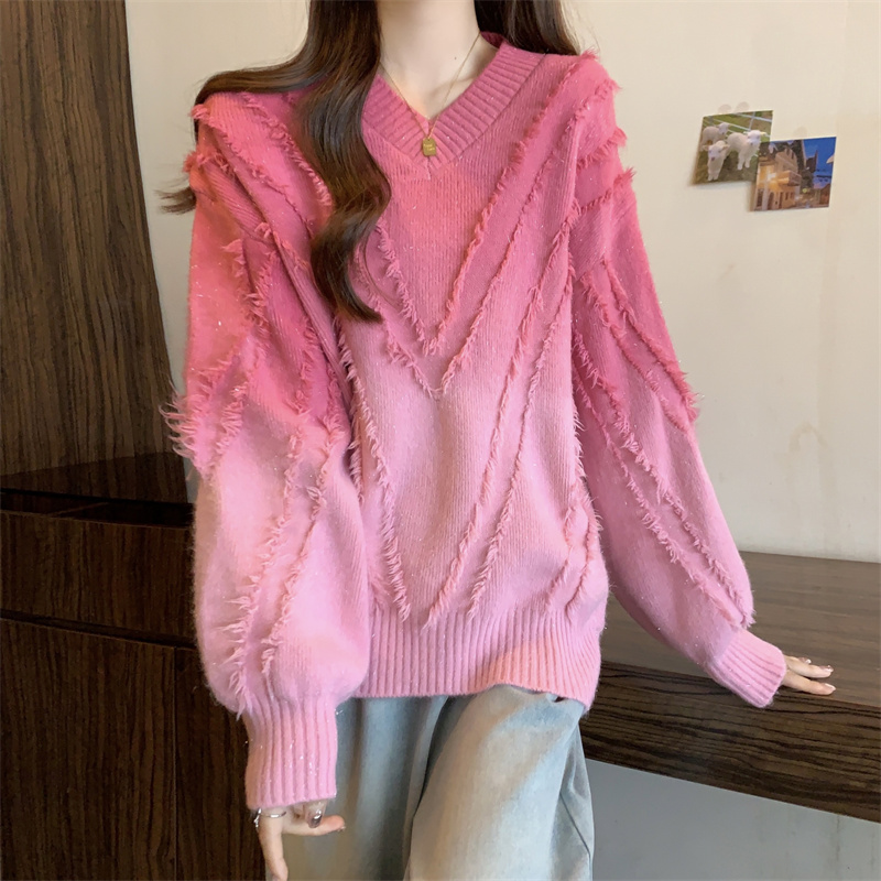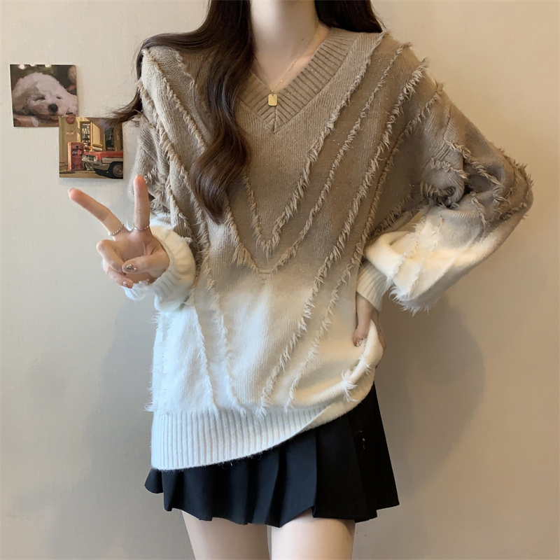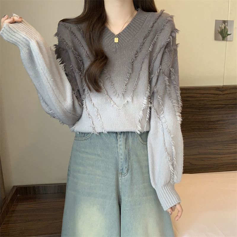FA52961# 大码秋冬新款胖mm渐变色V领流苏设计感慵懒宽松显瘦毛衣 服裝批發女裝批發服飾貨源