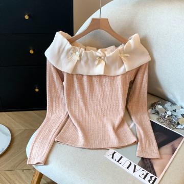 FA53361# 新款秋冬季雪纺一字肩甜美纯色长袖上衣打底衫 服裝批發女裝批發服飾貨源