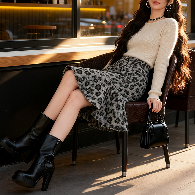 FA53448# 气质优雅毛圈豹纹鱼尾裙女中裙高腰显瘦垂感半身裙 服裝批發女裝批發服飾貨源