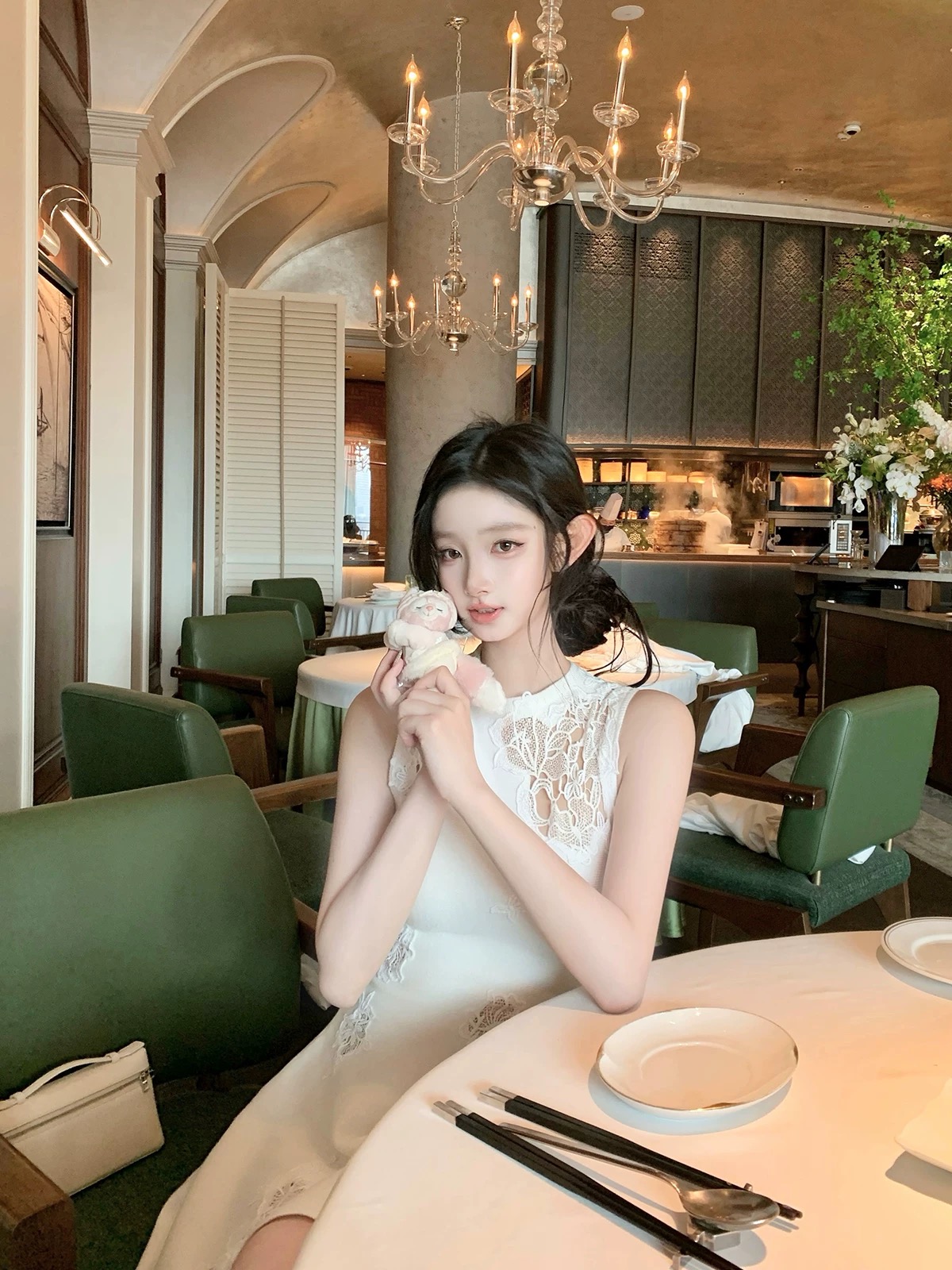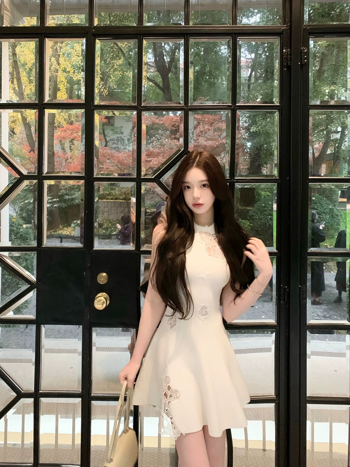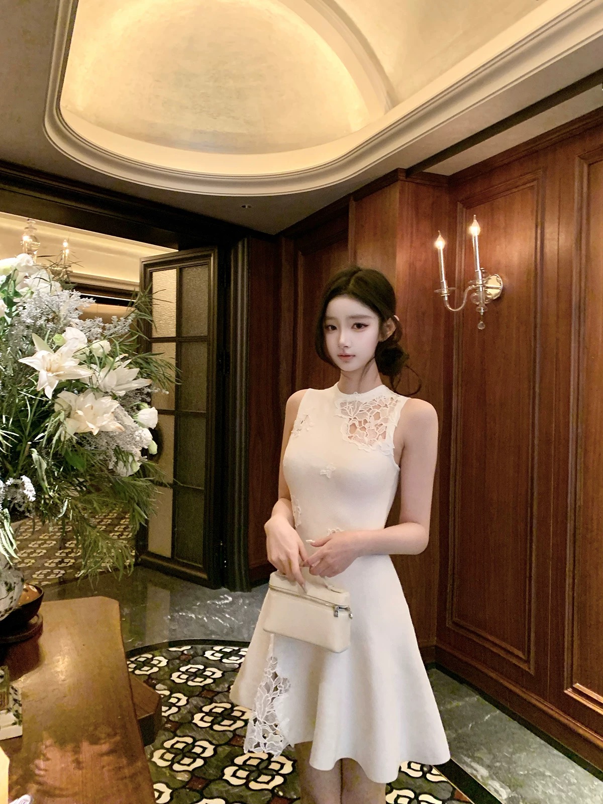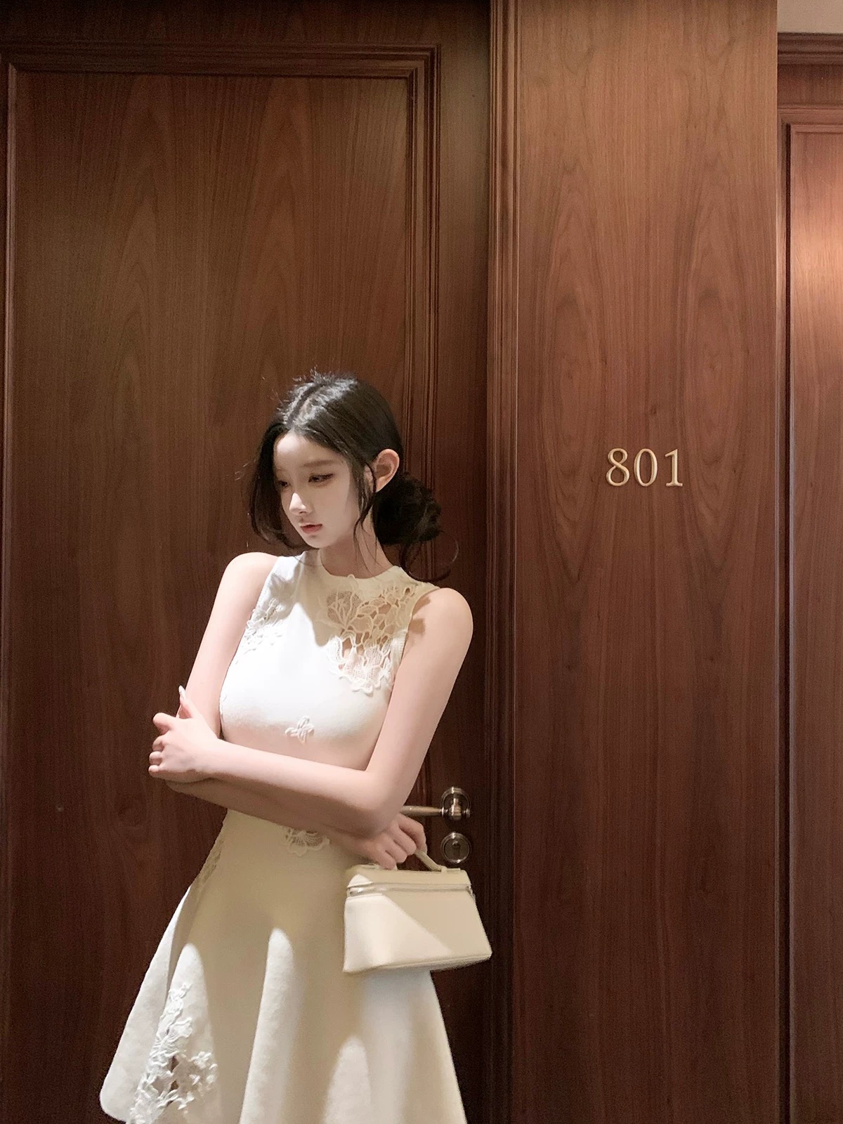 FA53463# Hotdog热狗很辣雪落蔷薇白色蕾丝镂空设计感无袖连衣裙短裙 服裝批發女裝批發服飾貨源