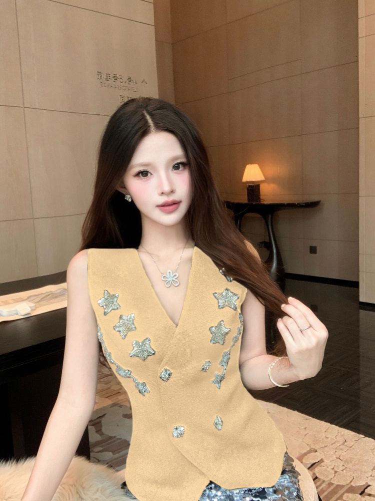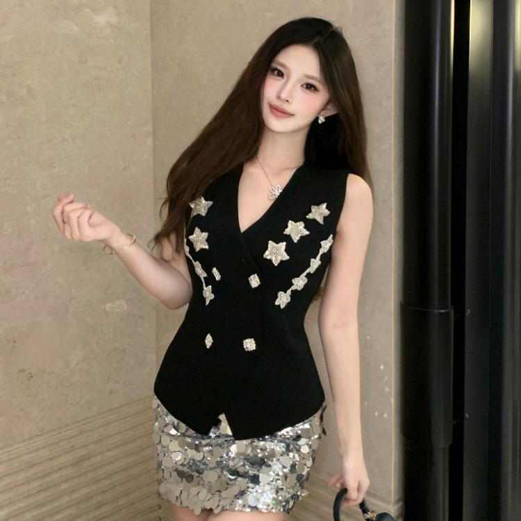 FA54297# 重工烫钻星星亮闪闪背心女法式无袖V领上衣春秋季节新款 服裝批發女裝批發服飾貨源