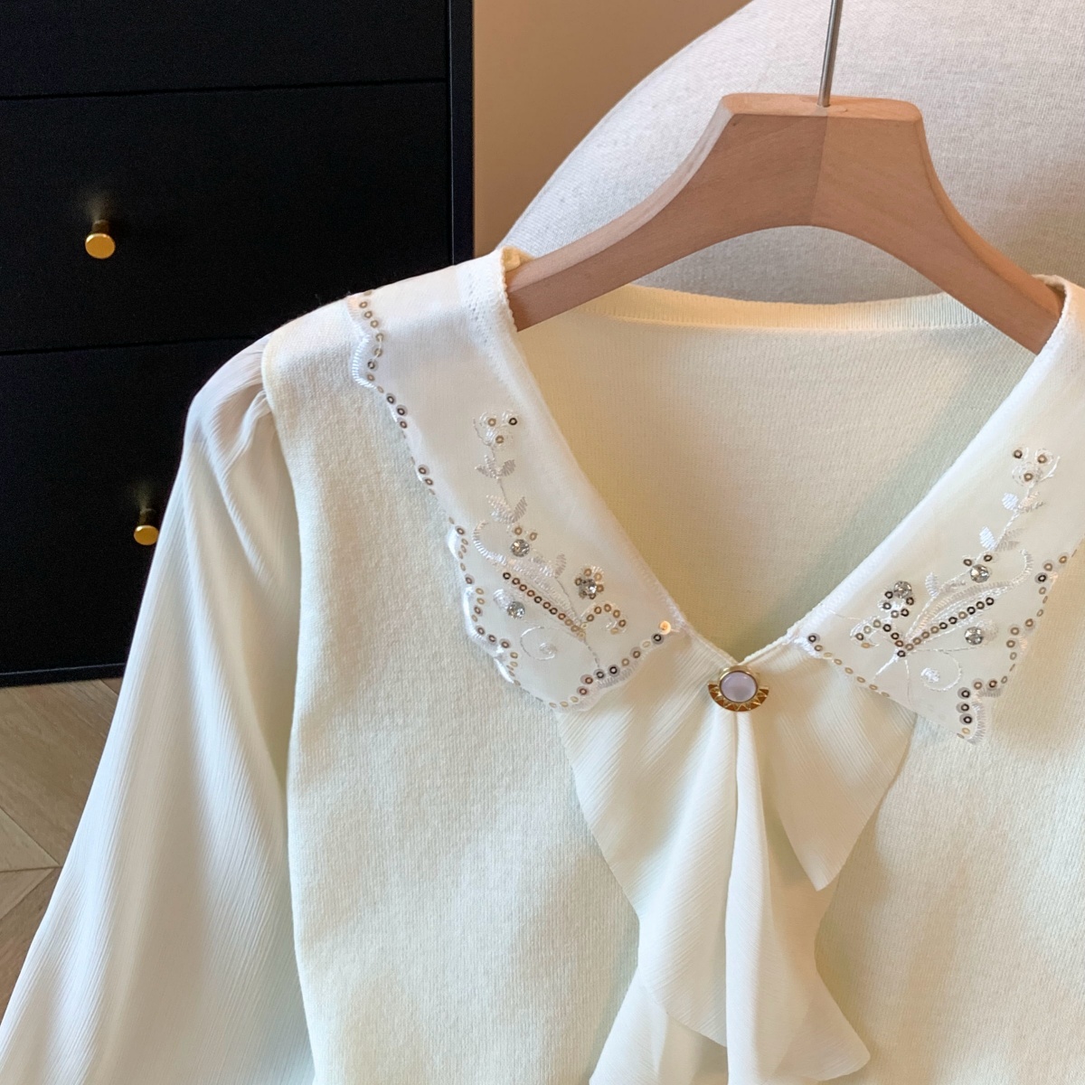 FA54402# 钉珠娃娃领雪纺长袖针织衫女秋季时尚洋气蕾丝拼接打底衫上衣 服裝批發女裝批發服飾貨源