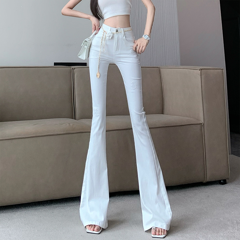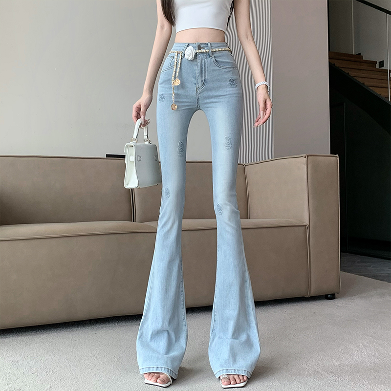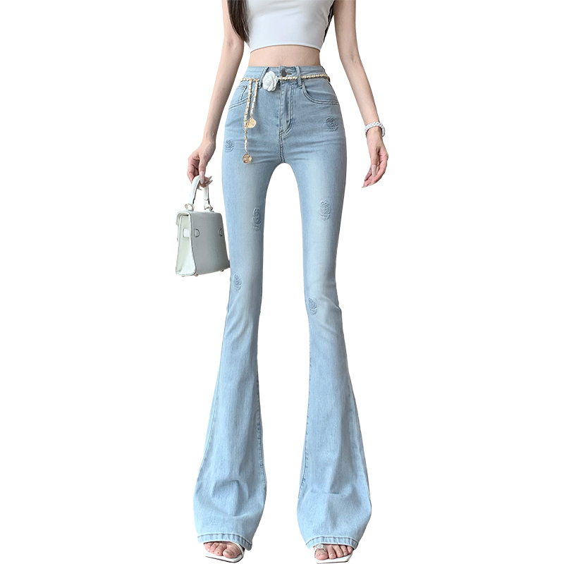 FA54540# 春夏新款高腰韩版个性玫瑰花压印牛仔喇叭裤女玫瑰花腰链 服裝批發女裝批發服飾貨源