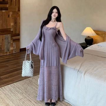 FA55031# 气质吊带缕空钩花针织连衣裙长裙高级感开衫外套套装 服裝批發女裝批發服飾貨源