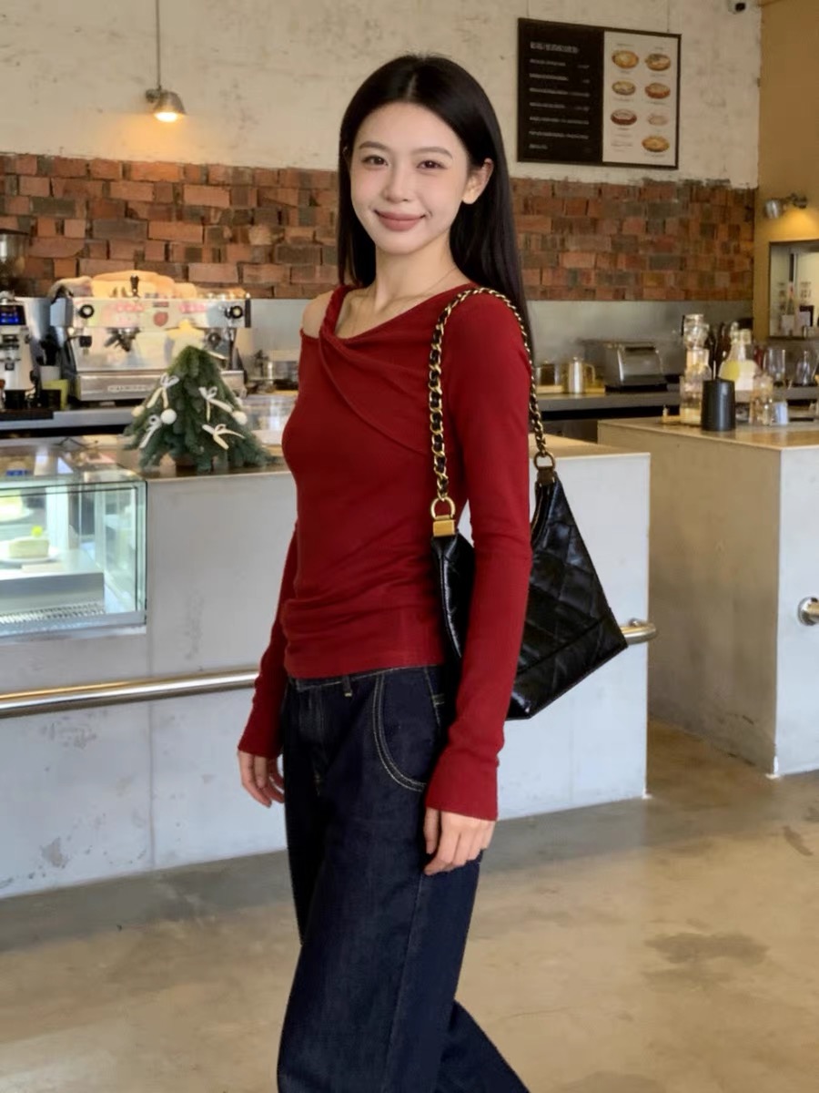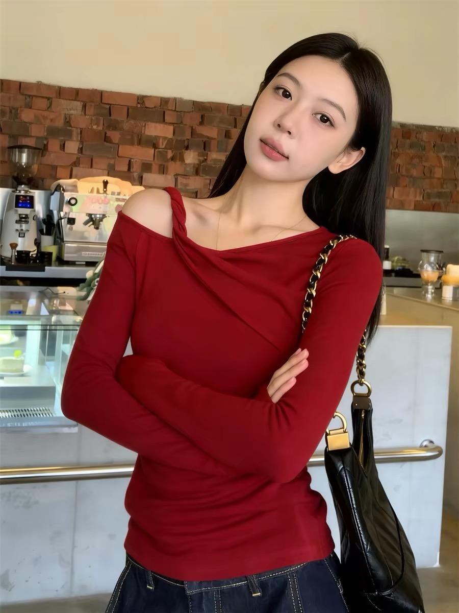 FA55379# 韩系辣妹早春穿搭红色斜肩上衣女春季新款长袖T恤设计感小众 服裝批發女裝批發服飾貨源