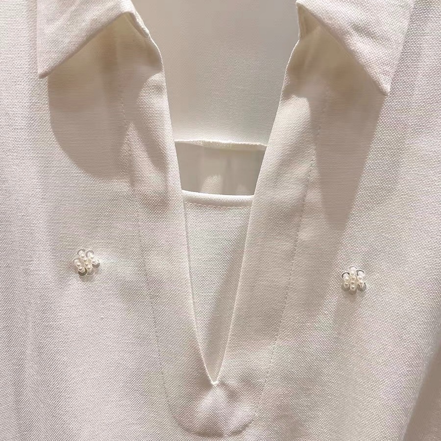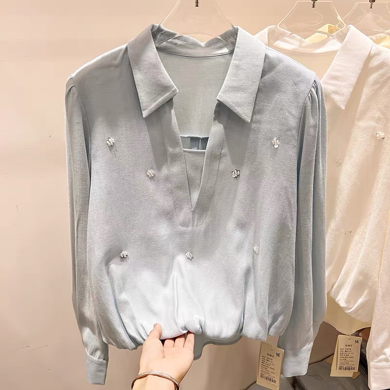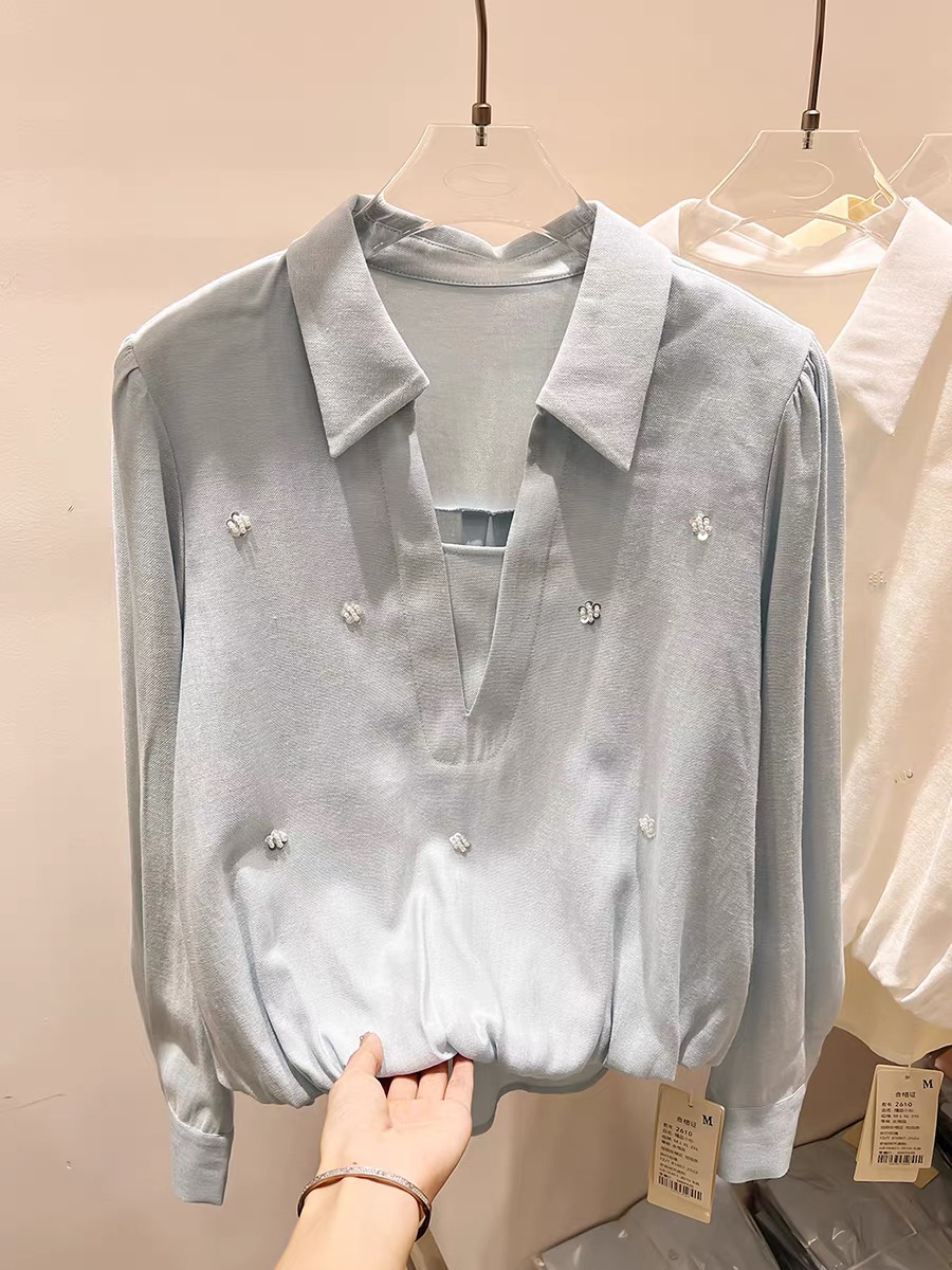 FA55541# 新款法式气质显瘦翻领开叉钉珠套头长袖衬衫女春季薄款上衣 服裝批發女裝批發服飾貨源