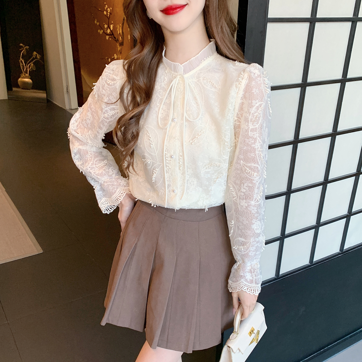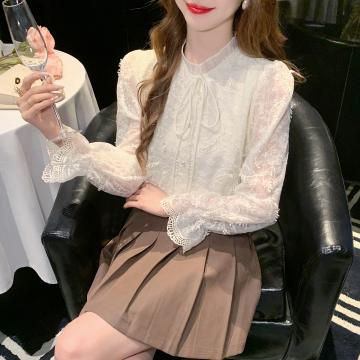FA55609# 春季法式浪漫风刺绣立领绑带长袖衬衫女蕾丝显瘦气质上衣 服裝批發女裝批發服飾貨源