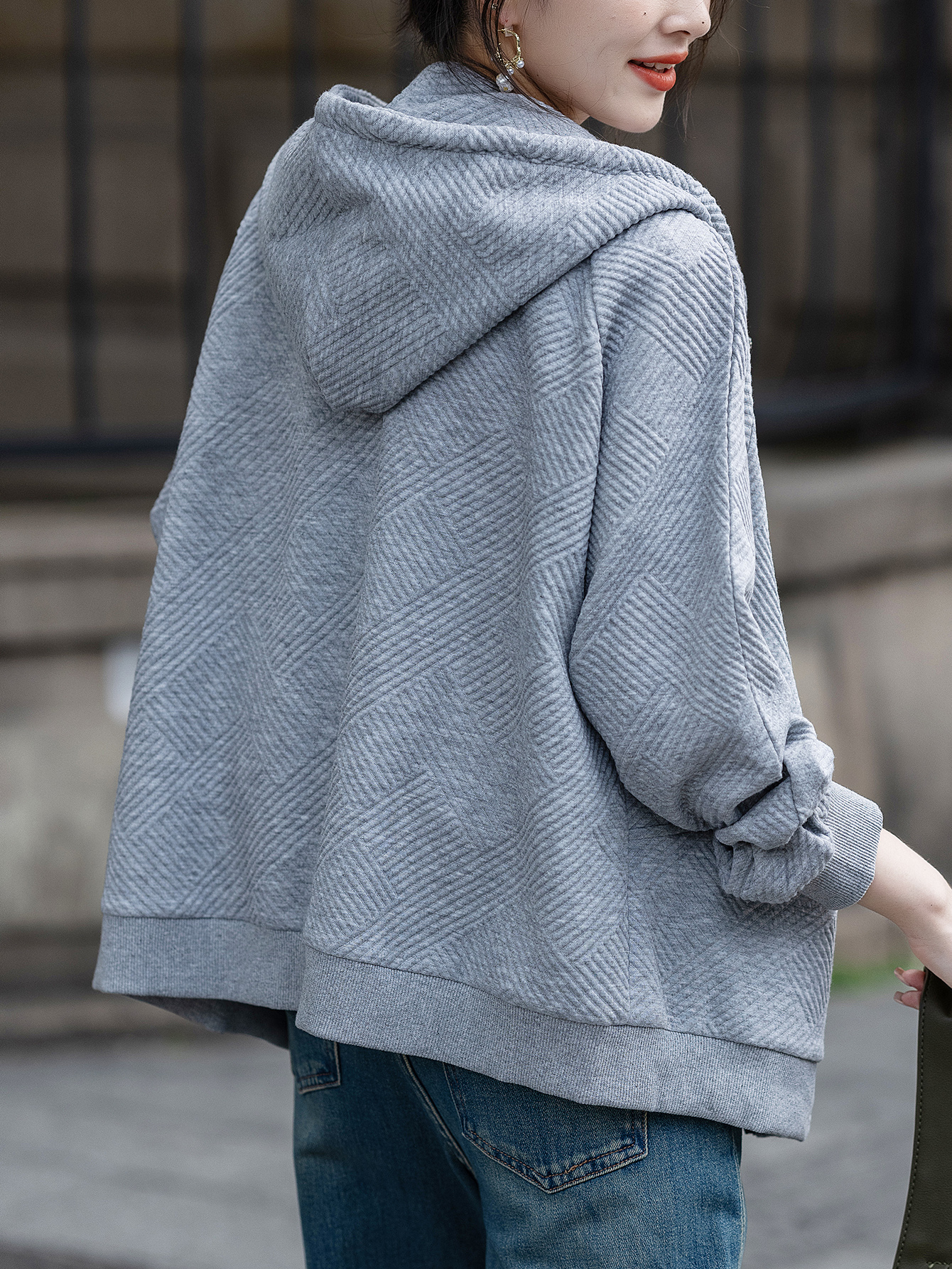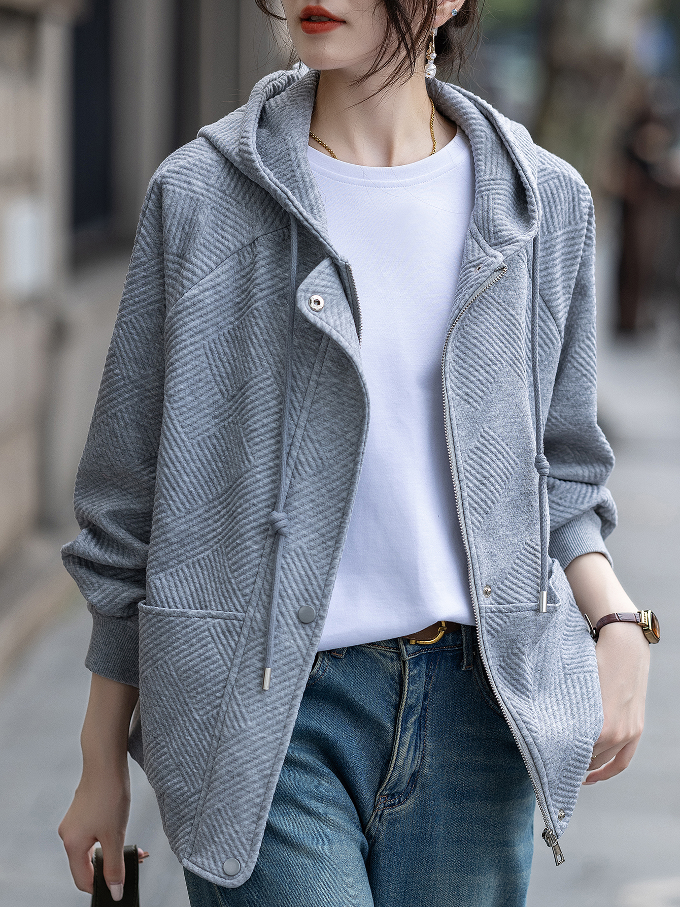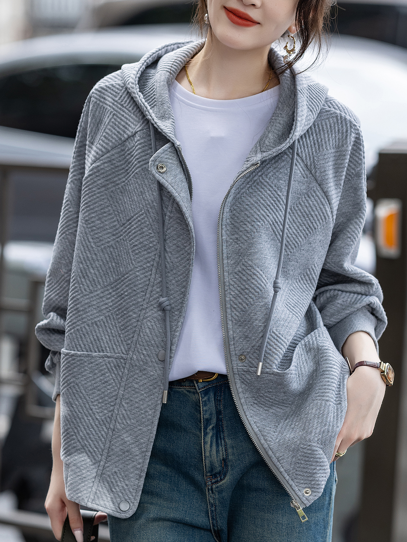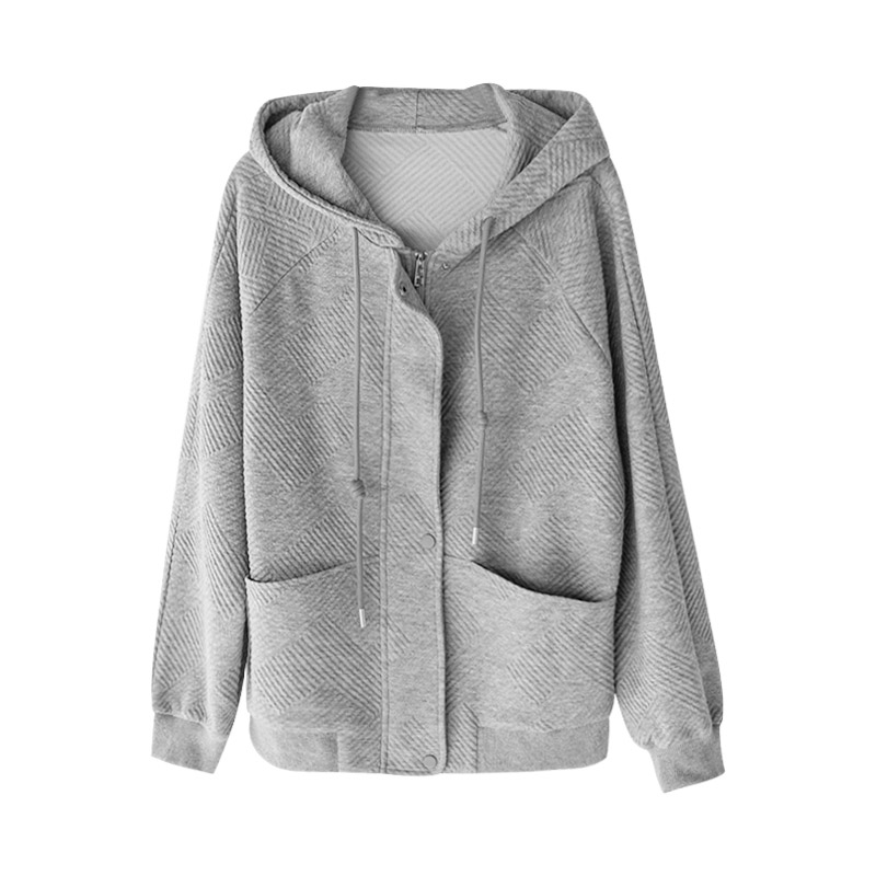 FA55674# 灰色连帽外套女春秋新款休闲简约百搭上衣 服裝批發女裝批發服飾貨源