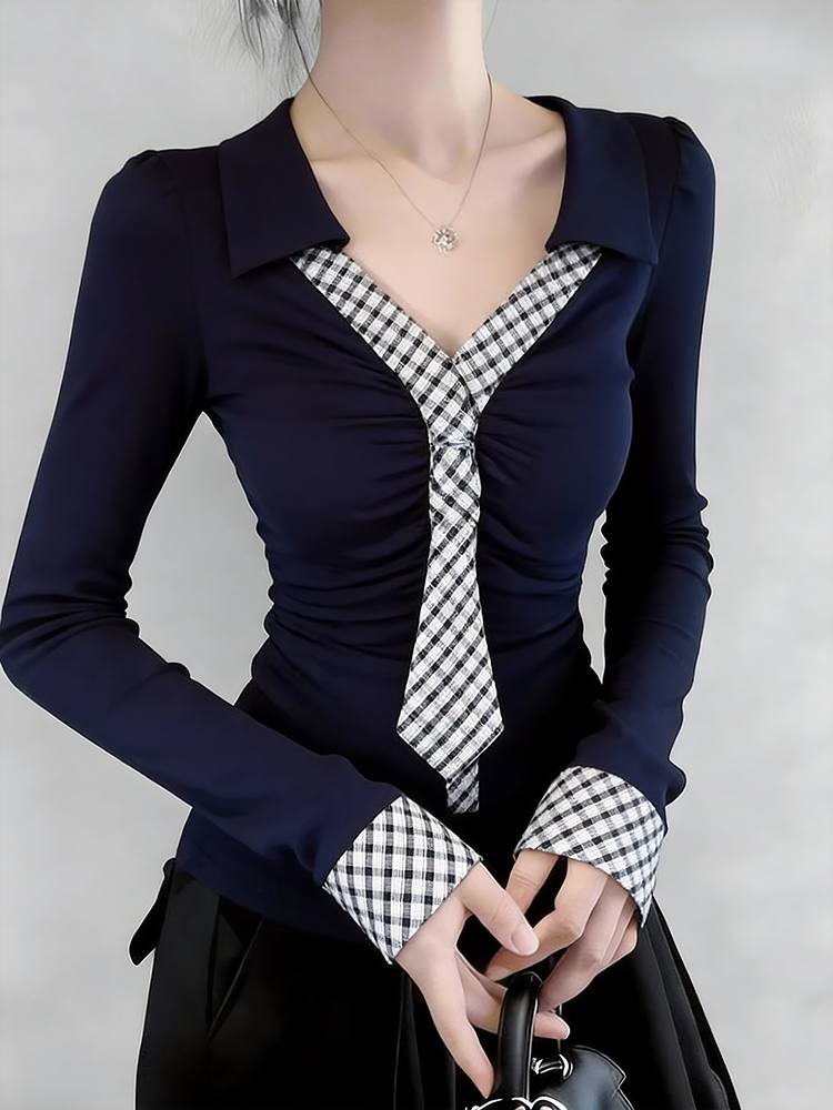 FA55802# 春秋复古格纹翻v领锁骨打底衫女内搭设计感甜辣妹掐腰长袖t恤上衣 服裝批發女裝批發服飾貨源