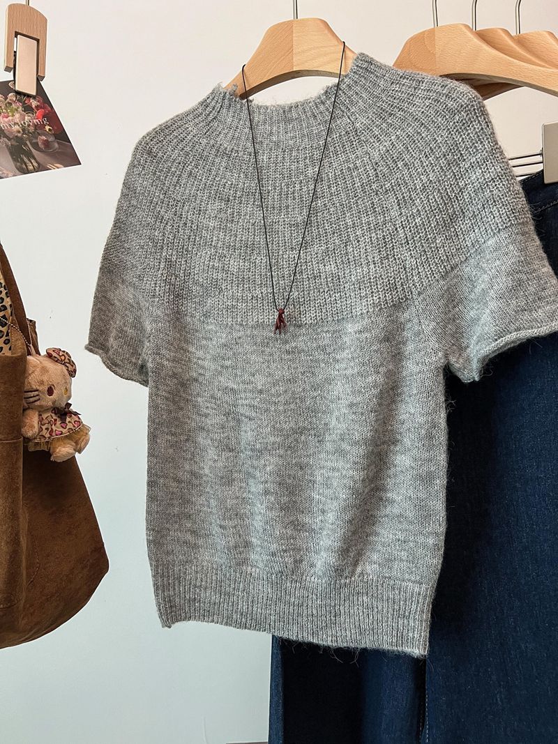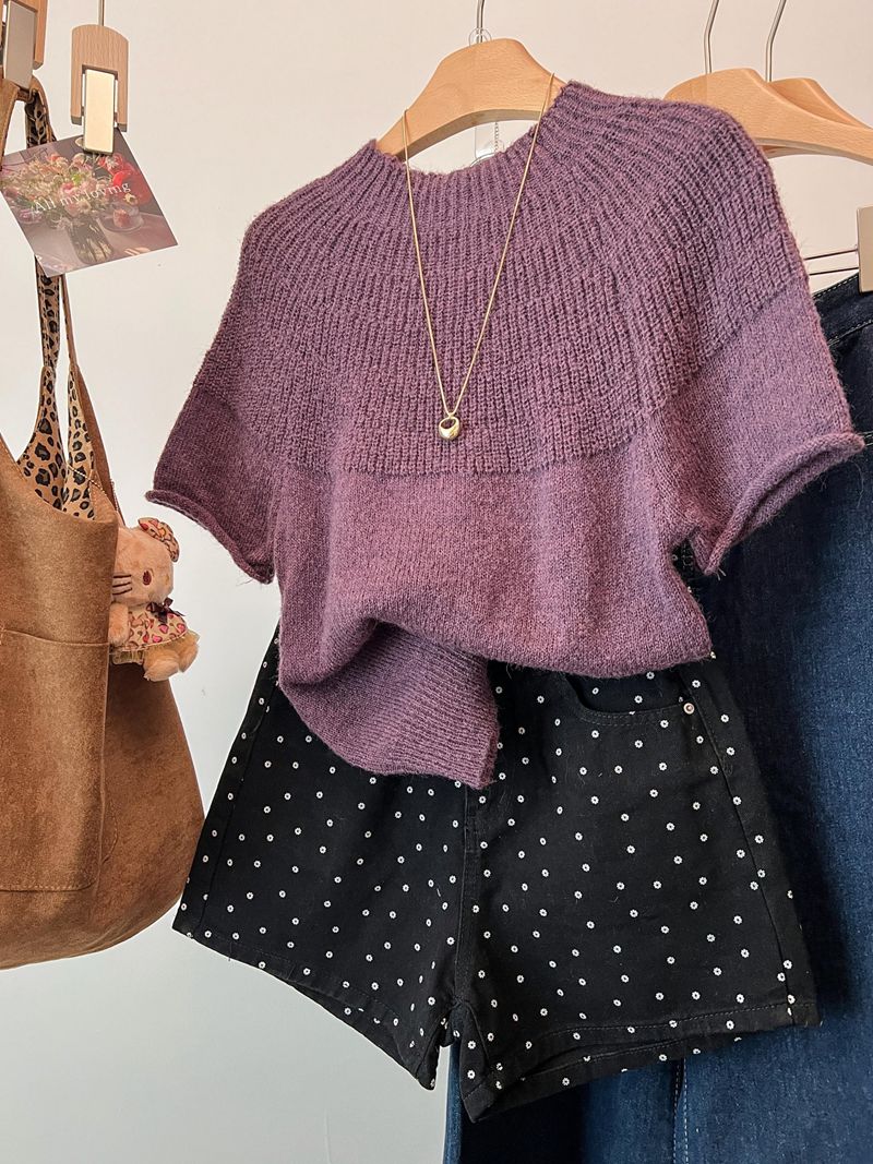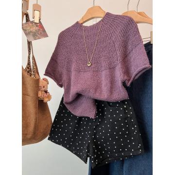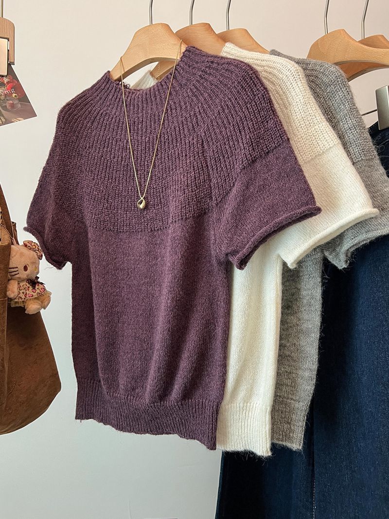 FA55966# 法式温柔纯色卷边针织短袖毛衣女春季设计感纹理领口修身软糯上衣 服裝批發女裝批發服飾貨源