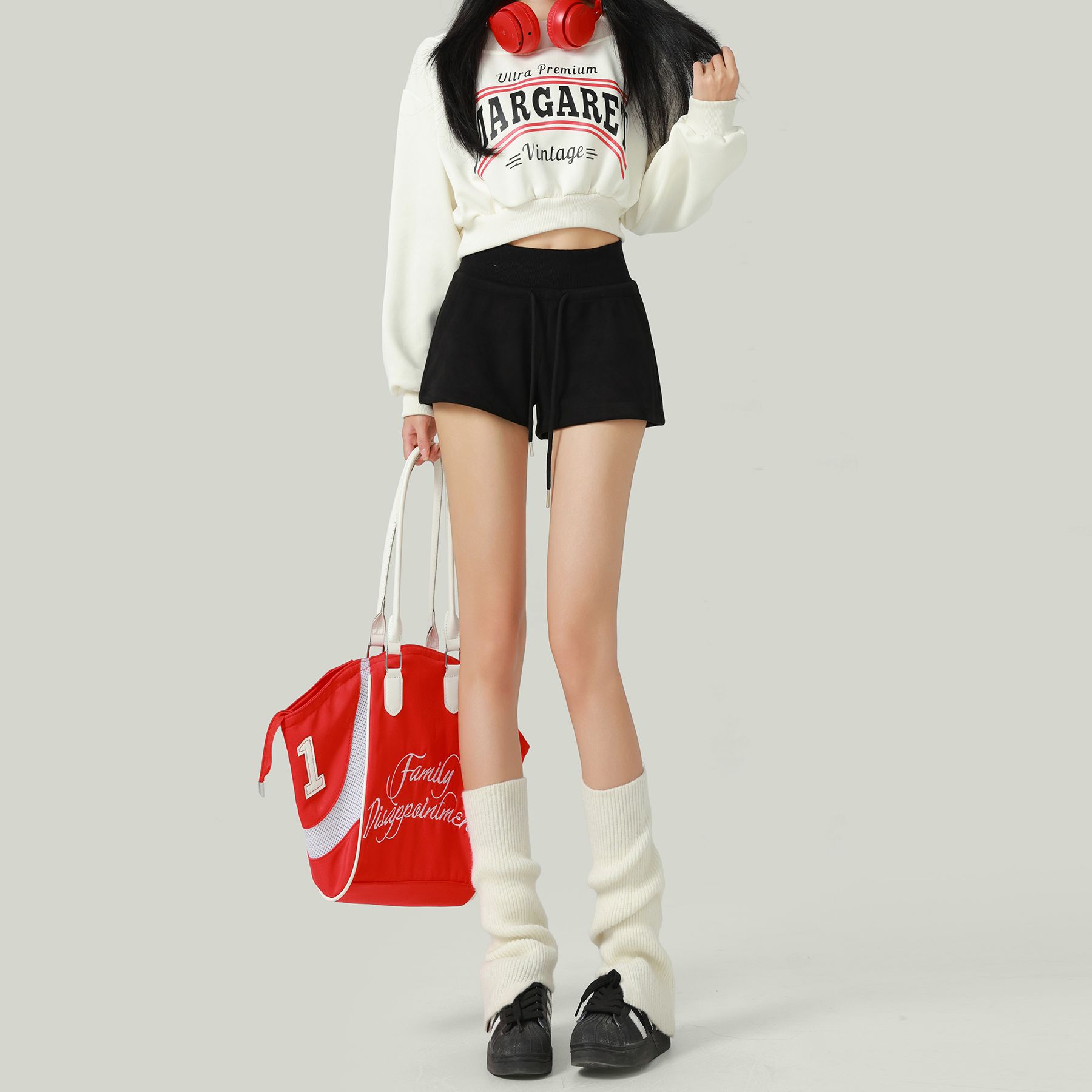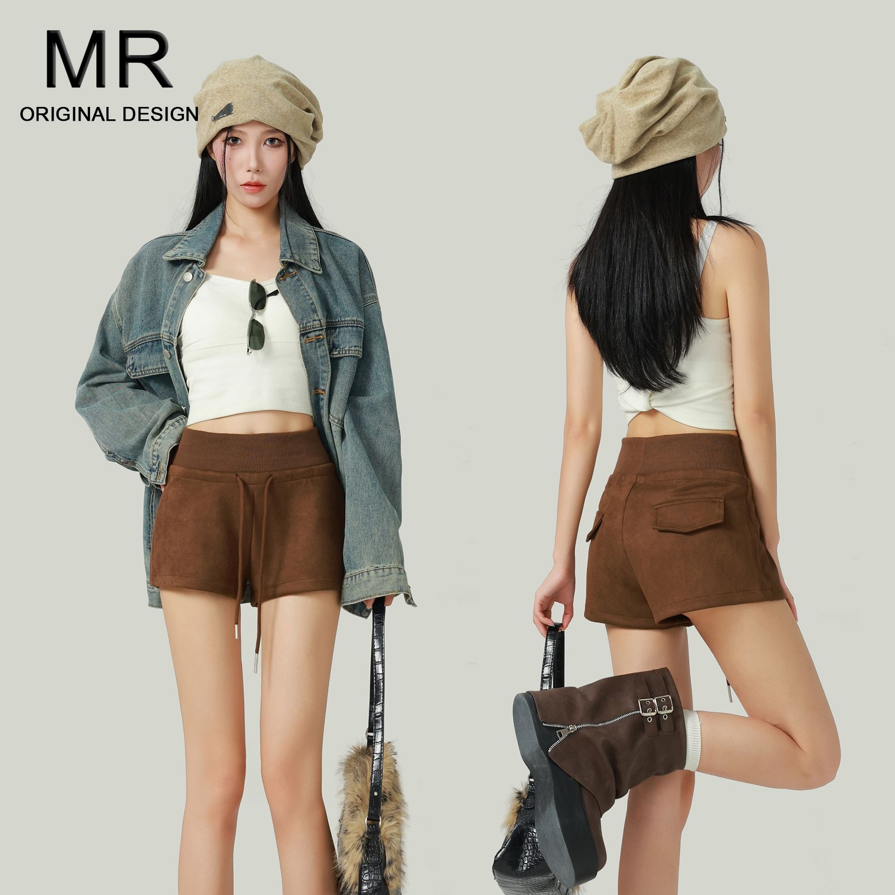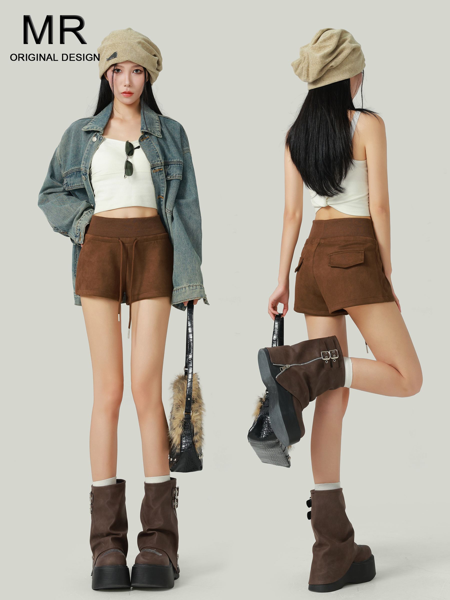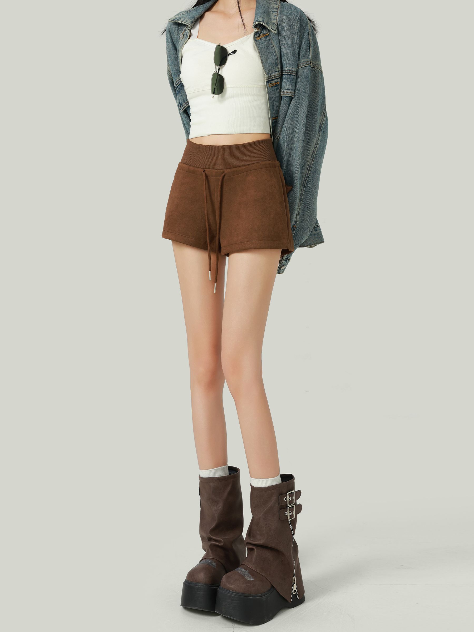 FA56185# 咖啡色鹿皮绒高腰休闲短裤女秋冬新款松紧腰显瘦外穿a字热裤 服裝批發女裝批發服飾貨源