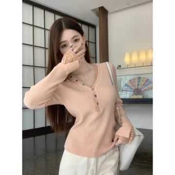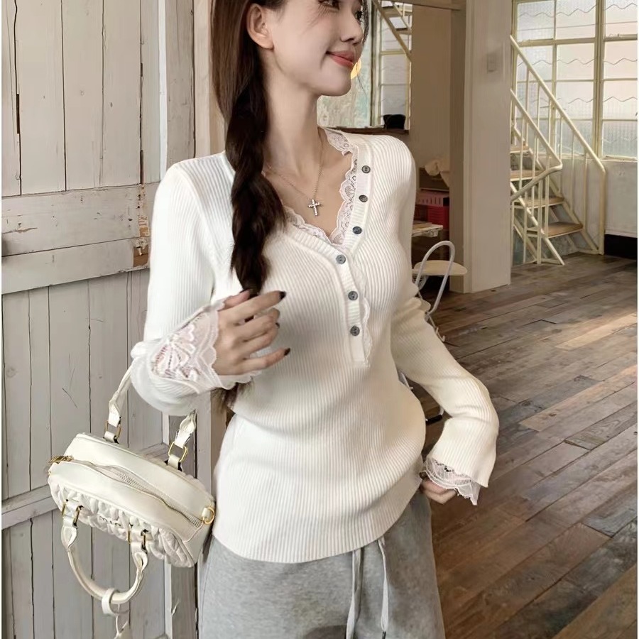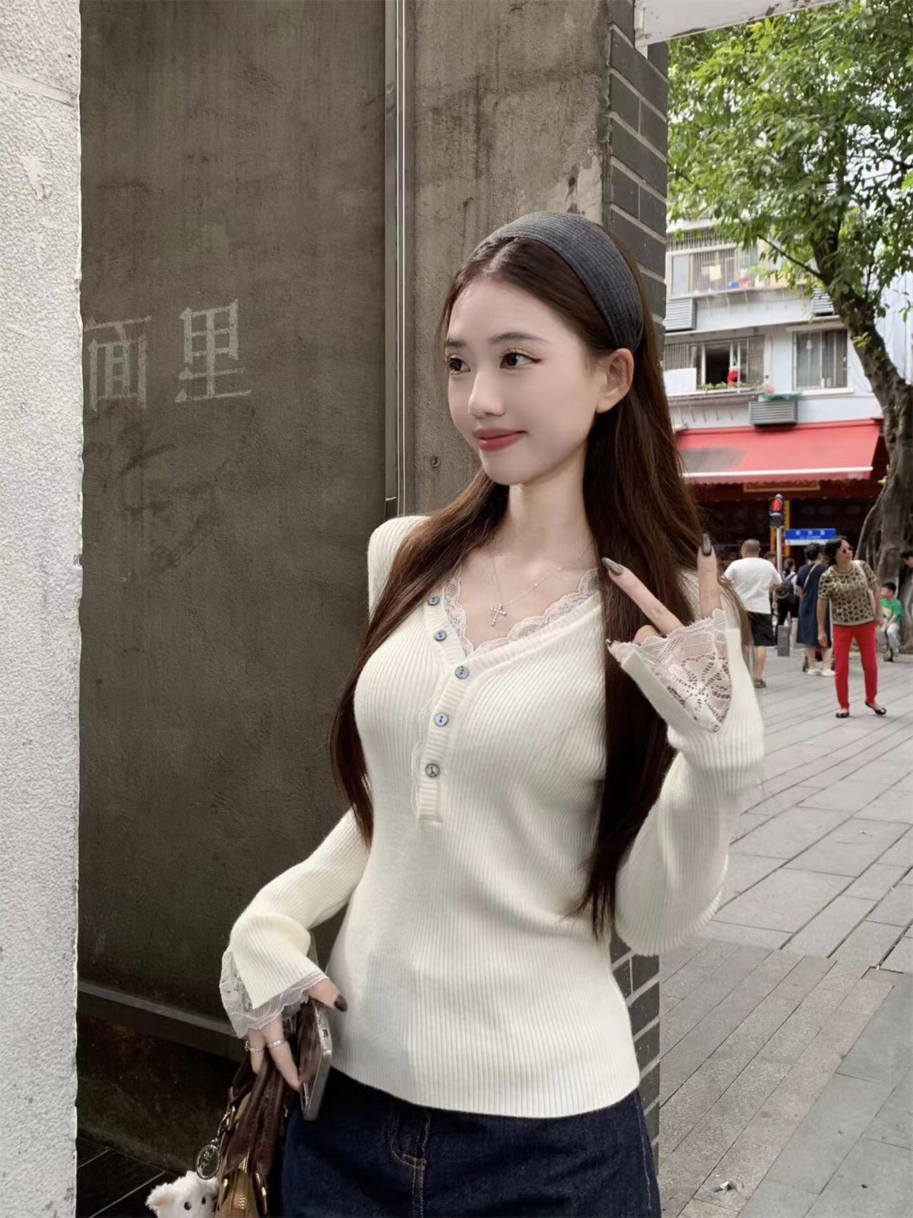 FA56212# 新款早春绝美蕾丝v领打底衫女内搭高级感毛衣长袖针织上衣 服裝批發女裝批發服飾貨源