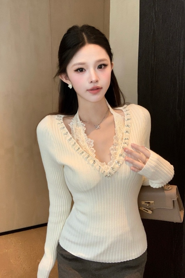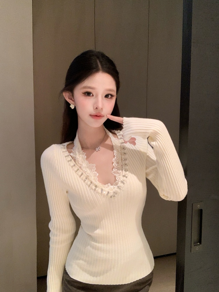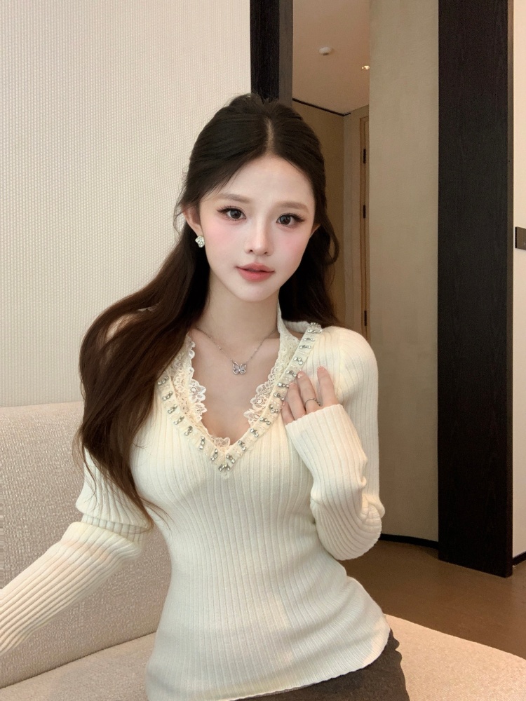 FA56249# 法式气质钉珠蕾丝拼接针织衫女长袖收腰黑色打底毛衣上衣 服裝批發女裝批發服飾貨源