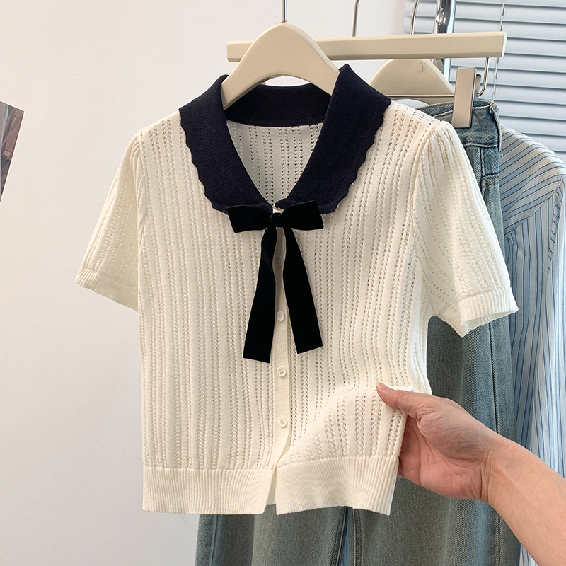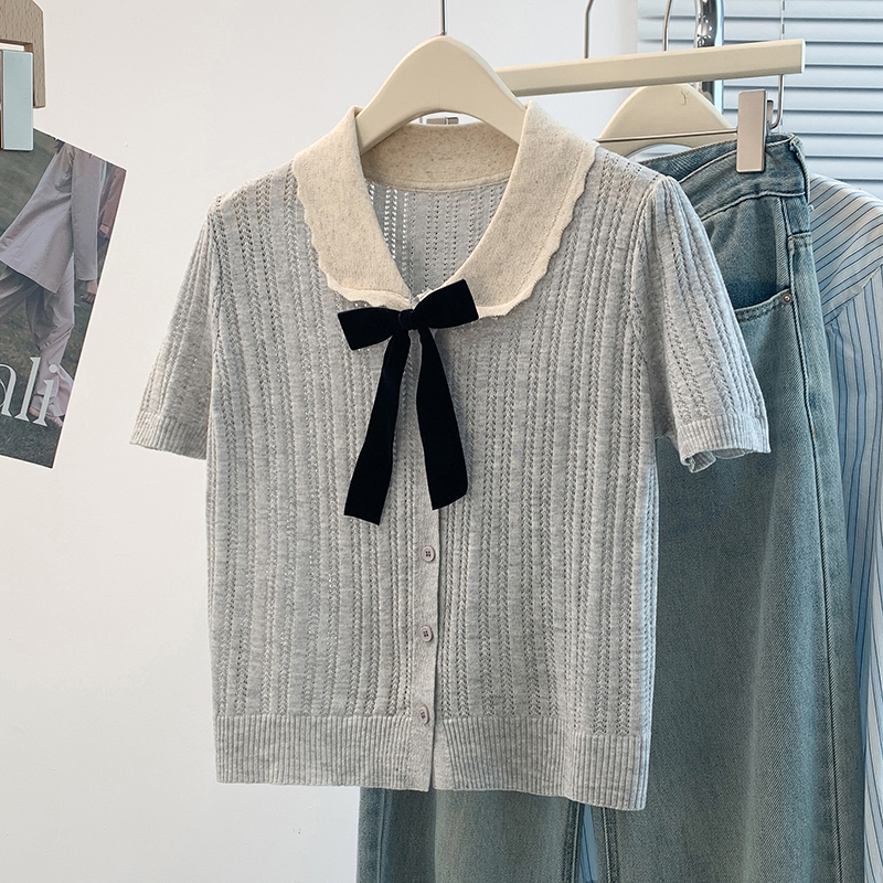 FA56270# 大码女装胖mm夏季新款针织镂空娃娃领显瘦遮肚子短袖T恤上衣 服裝批發女裝批發服飾貨源