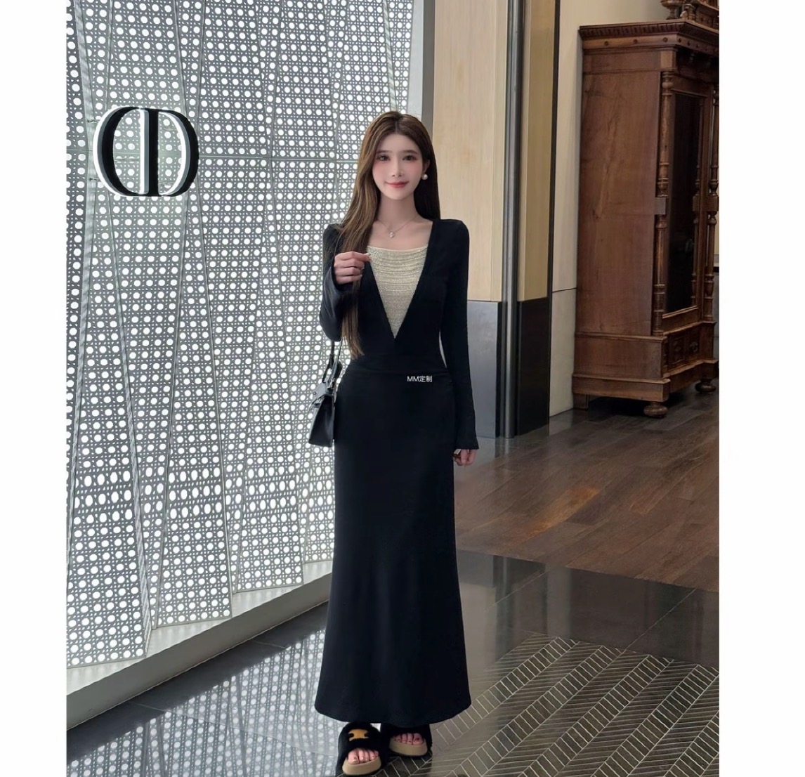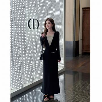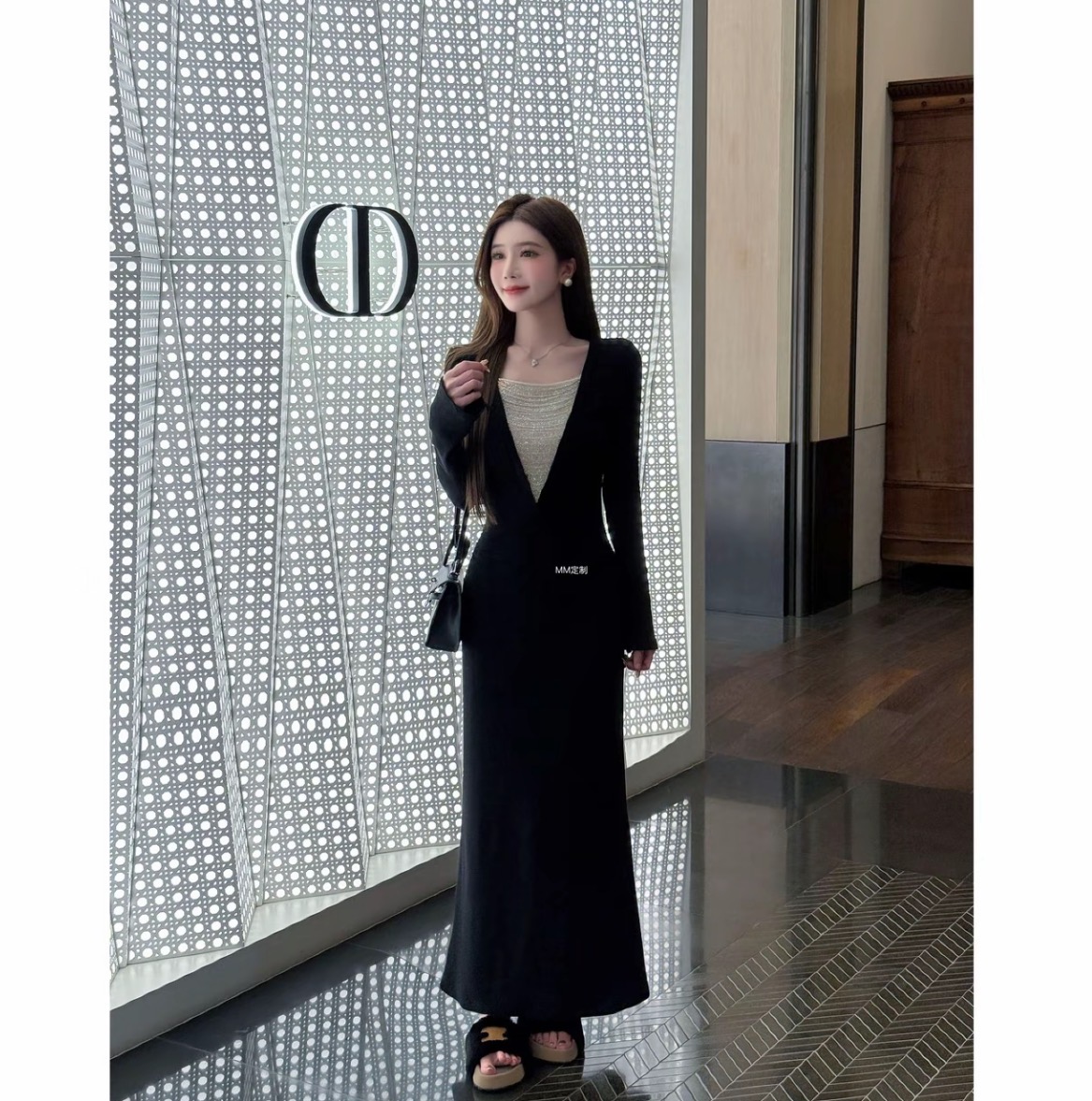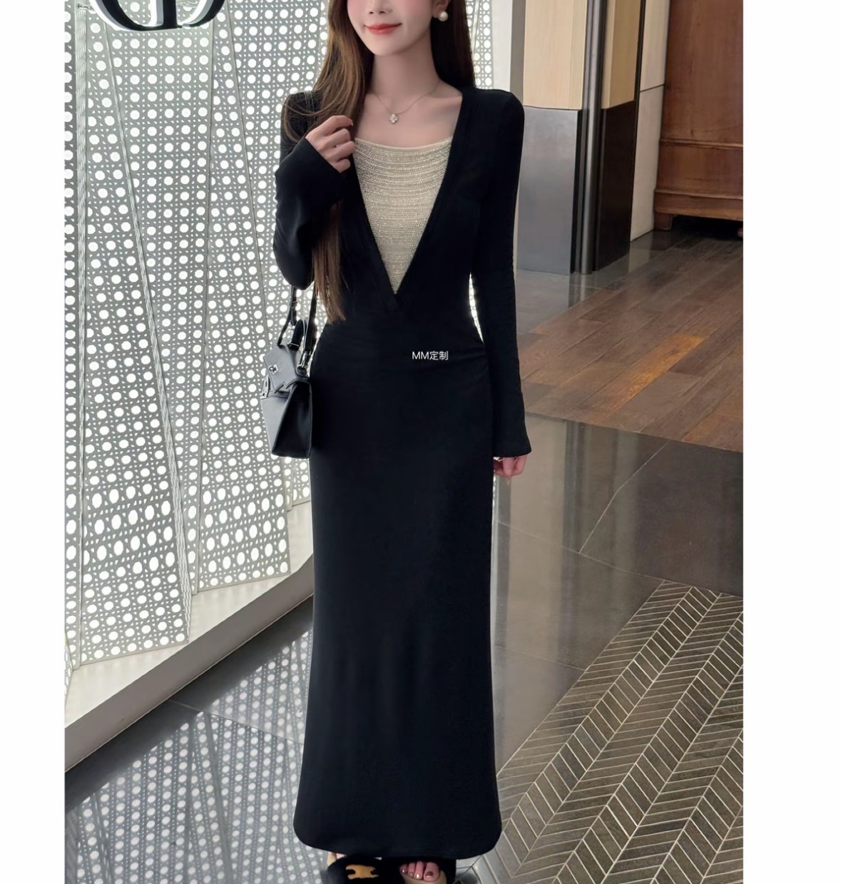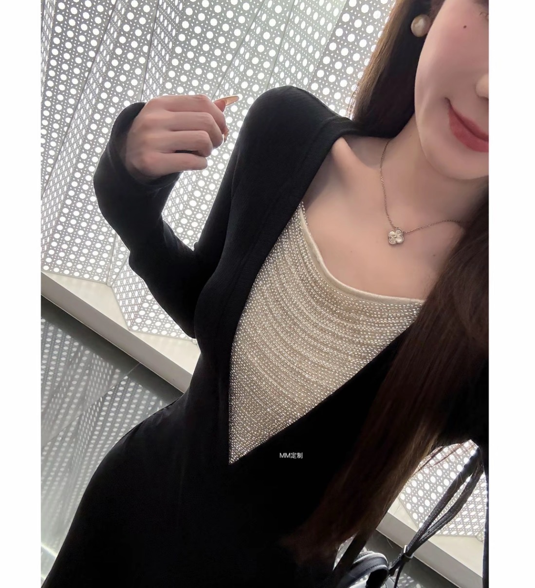 FA56288# 人生限定月夜巴黎设计感深V领重工珠链拼接打褶显瘦连衣裙 服裝批發女裝批發服飾貨源
